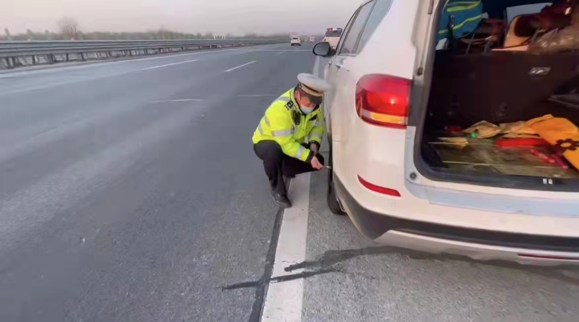 2月8日17时许,高速交警深州大队交警在大广高速公路北京方向巡逻时,发现1495公里处应急车道内停有一辆小型越野汽车,并未摆放三角标志,交警立即停车上前查看情况。