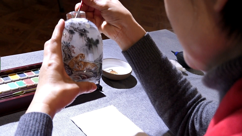 除了创作老虎题材的作品外,为助力2022年北京冬奥会,“衡水内画”省级传承人王自勇还带领弟子用心用情创作了28件冬奥题材的内画作品。“除了传统的鼻烟壶,还采用酒瓶、茶叶罐和笔筒作为内画的载体,在献礼冬奥会的同时,推进衡水内画艺术的传承弘扬。”