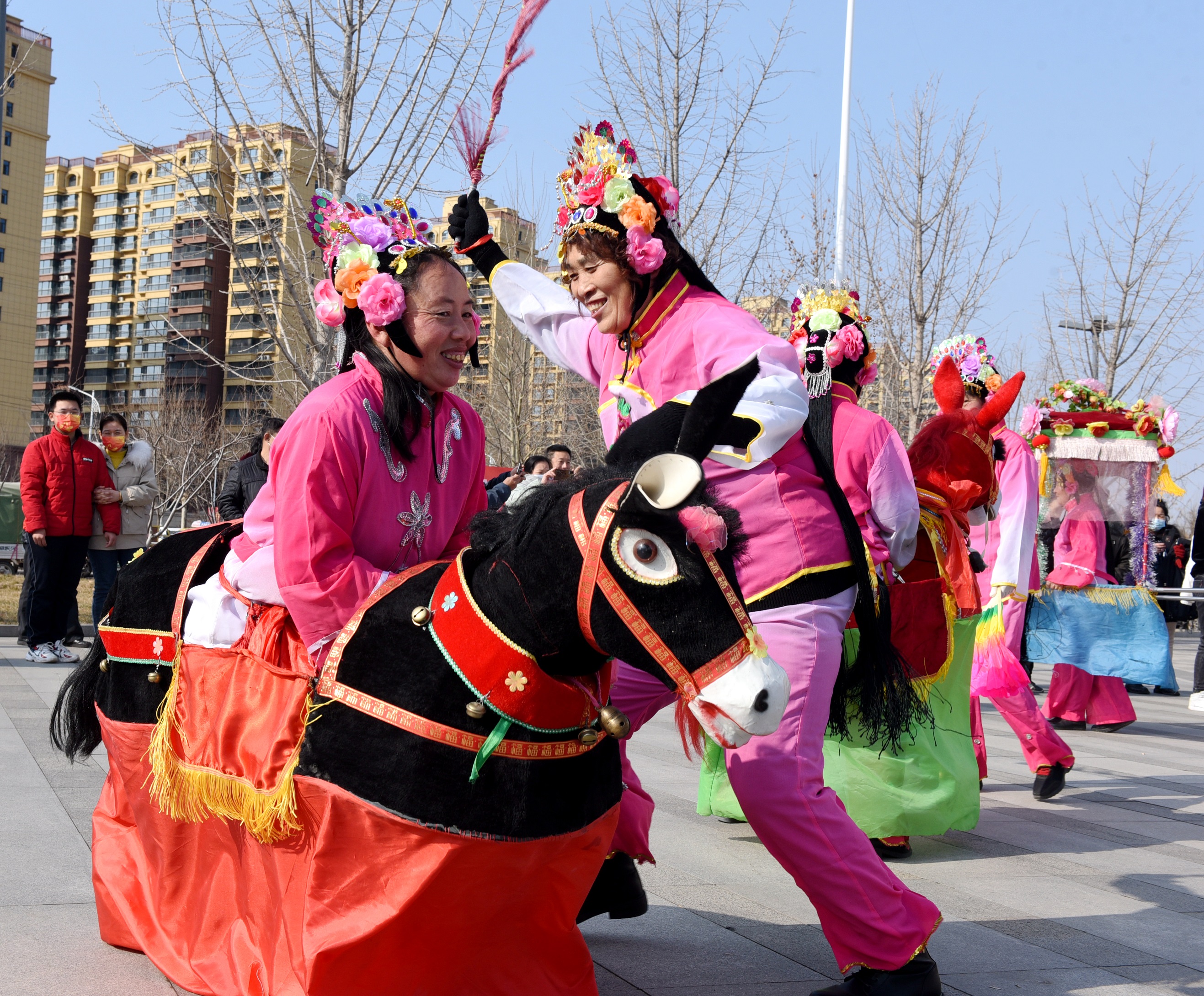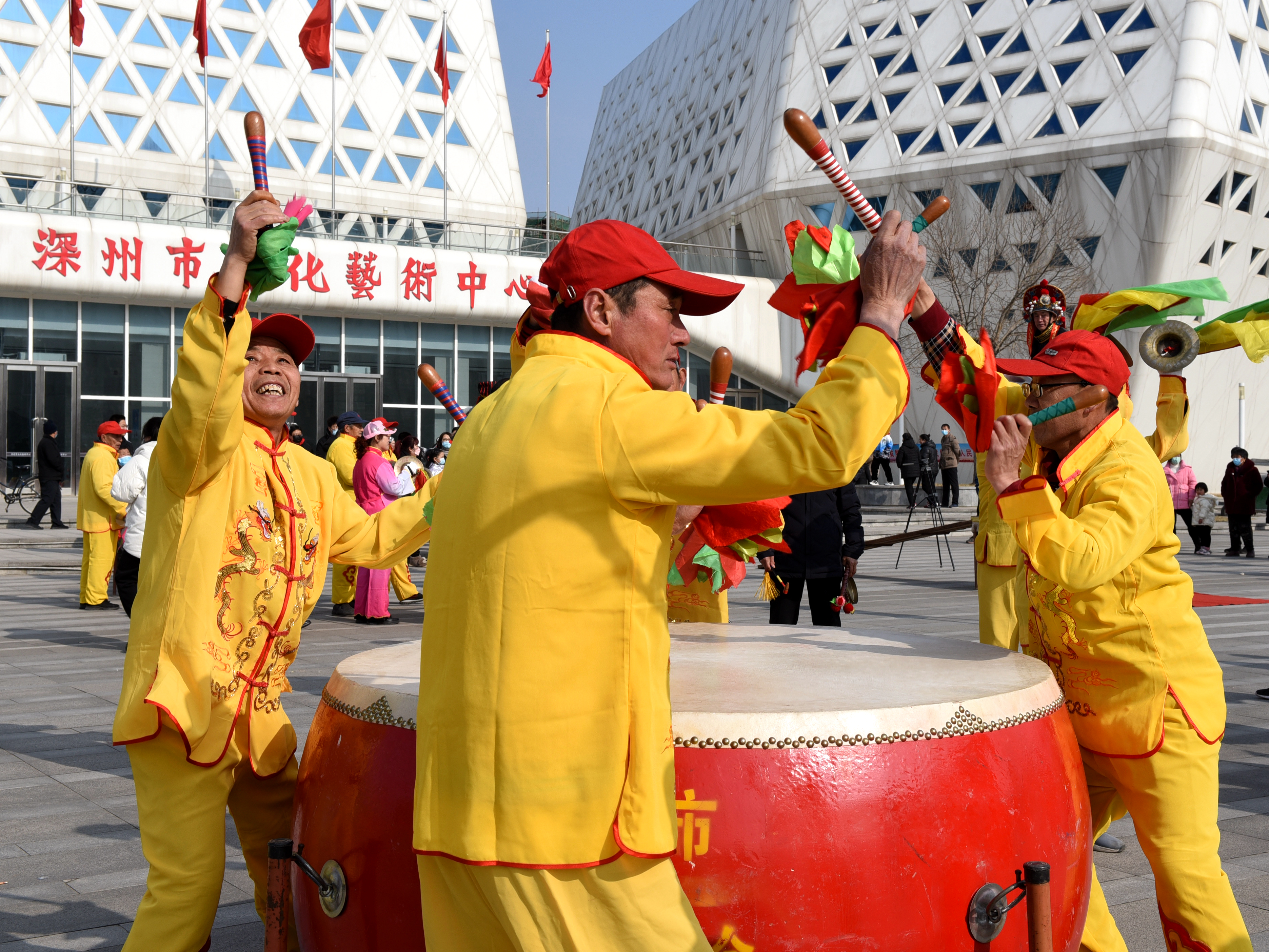 金虎欢腾辞旧岁,迎新锣鼓闹元宵。2月15日,衡水深州市文化艺术中心广场上人头攒动,锣鼓喧天,彩绸飘扬,好不热闹,来自深州市的10多个民间艺术队自发组织的民间花会表演精彩上演。