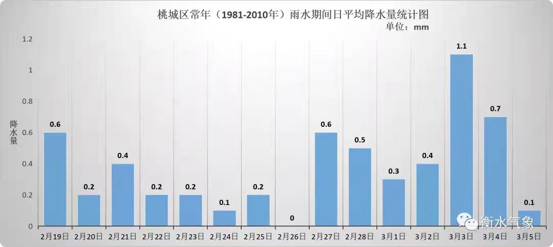 俗语用“春雨贵如油”,来反应雨水期间的降水程度。以桃城区为例,从常年(1981年—2010年)雨水期间的降水统计资料上来看,虽有降水过程出现但降水量总体不大,多以小雨或毛毛细雨为主。
