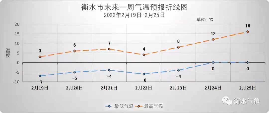 具体天气预报为:2月19日,晴间多云,气温:3到-7℃;2月20日,晴间多云,西南风3~4级,转北风2~3级,气温:7到-5℃;2月21日,多云转晴,南风2级,转东北风3~4级,气温:6到-5℃;2月22日,晴间多云,气温:5到-7℃;2月23日,晴间多云,气温:8到-4℃;2月24日,晴间多云,气温:12到-1℃;2月25日,晴间多云,西南风3~4级,转西北风4~5级,气温:16到0℃。