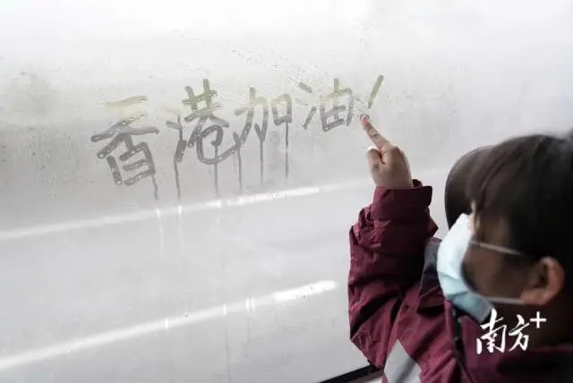 2月19日中午,由广东省中医院选派的第二批内地援港抗疫医疗防疫工作队队员在广州集结出发,路上,队员在车上的窗户写下“香港加油”。南方+ 张梓望 拍摄