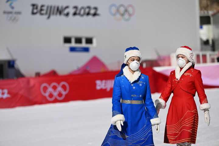 2月1日,身着颁奖礼服的志愿者在国家高山滑雪中心演练颁奖环节。新华社记者 连振 摄