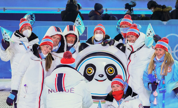 2月14日,挪威代表团成员在张家口赛区颁奖广场与“冰墩墩”合影。新华社记者 丁汀 摄