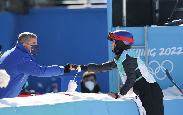 2月8日,国际奥委会主席巴赫(左)向获得自由式滑雪女子大跳台冠军的中国队选手谷爱凌表示祝贺。新华社记者 丁旭 摄