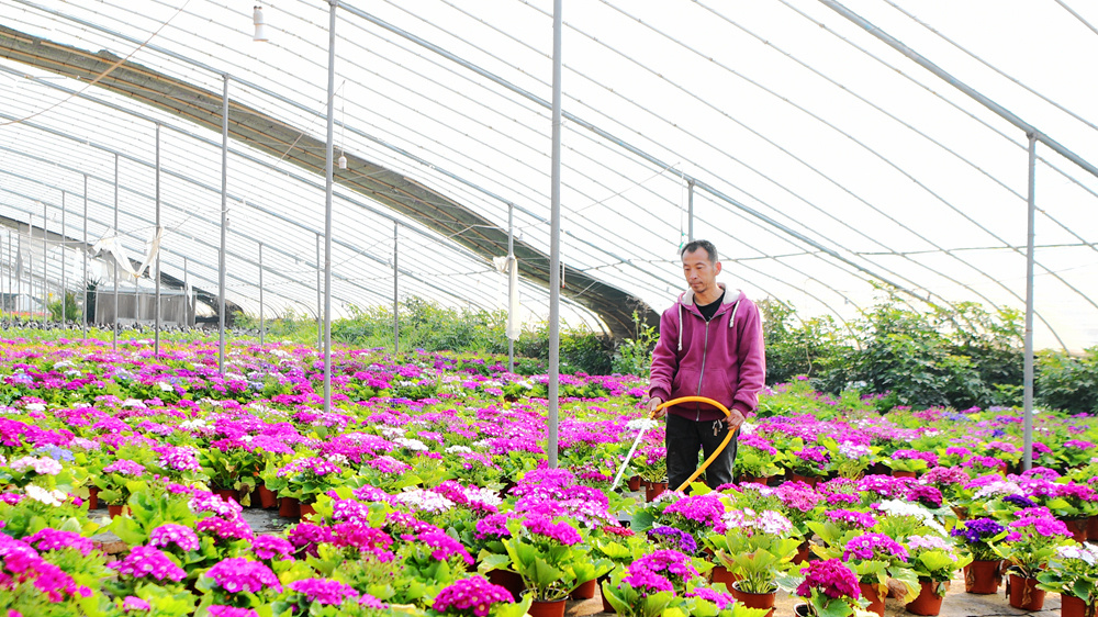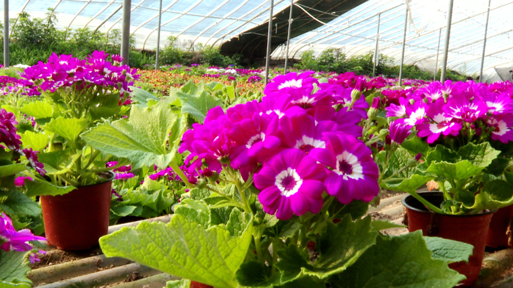 大棚里各类花卉争相斗艳,郑雪芹夫妇穿梭在花田间,熟练地给花浇水、修剪、施肥。