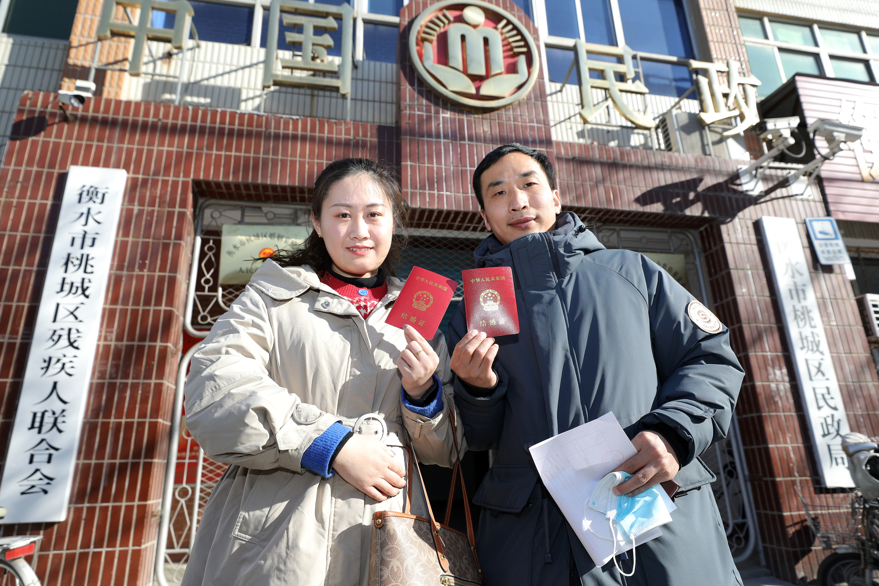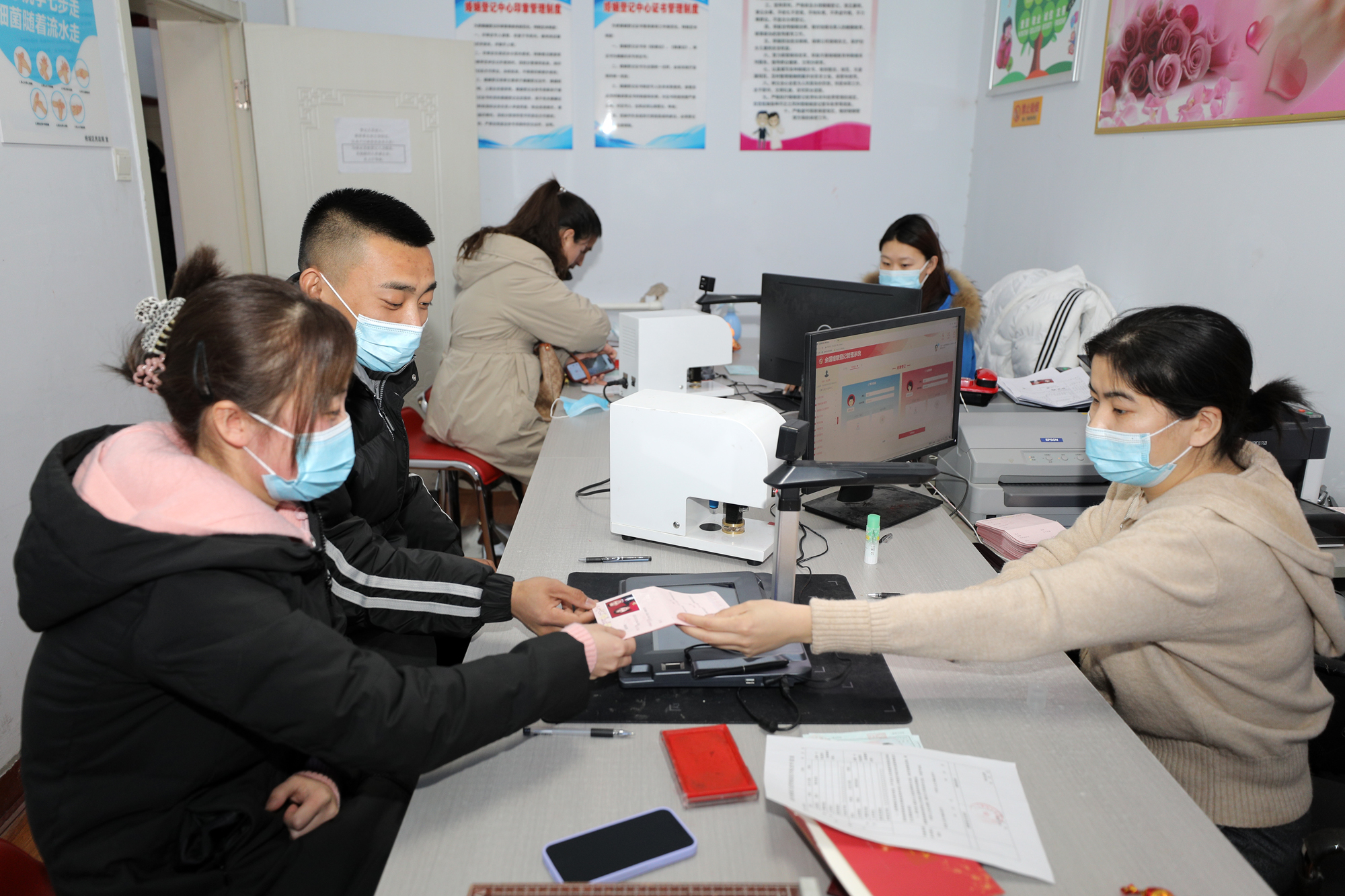 新人正在办理结婚证。