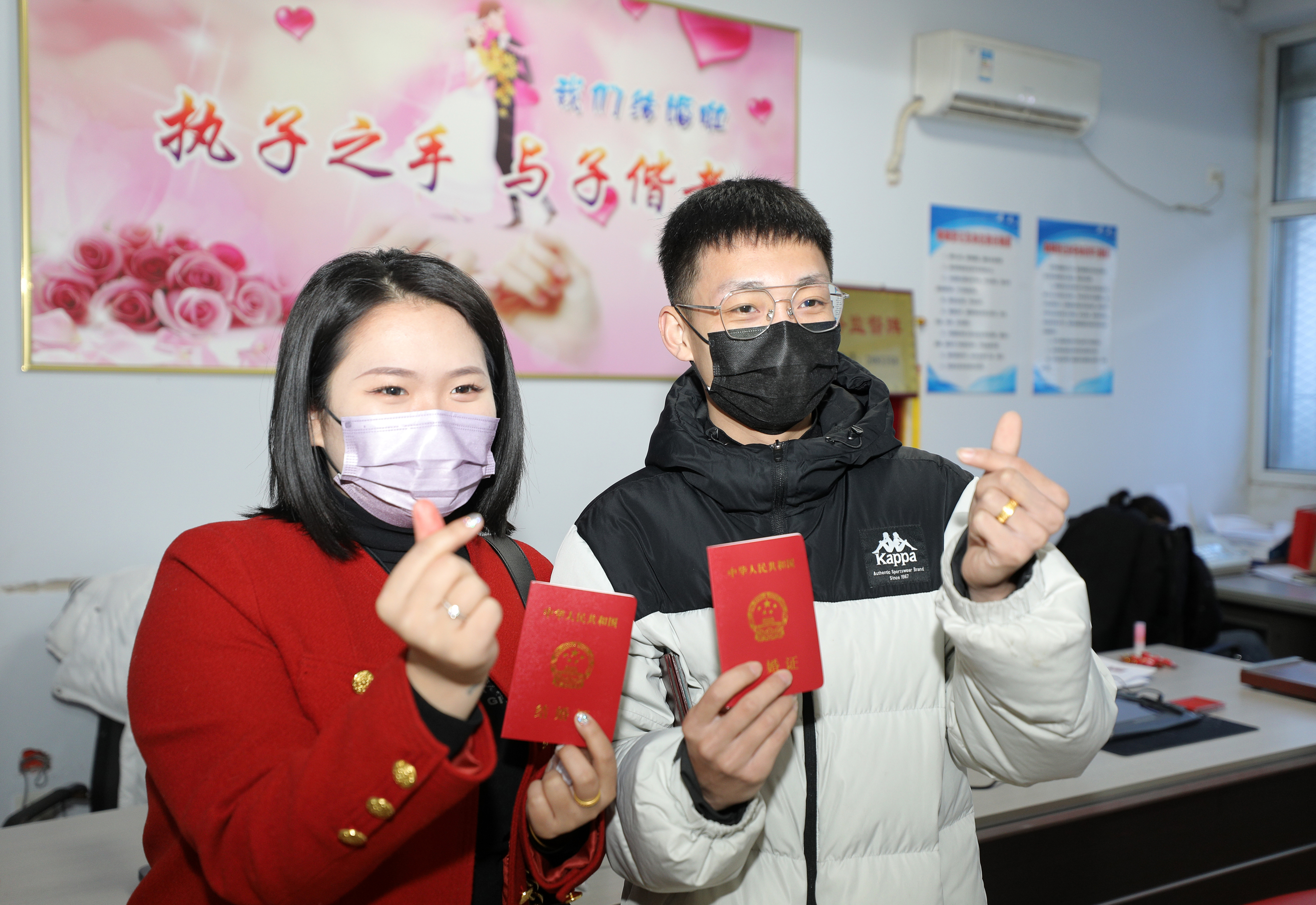 新人展示刚领取的结婚证。
