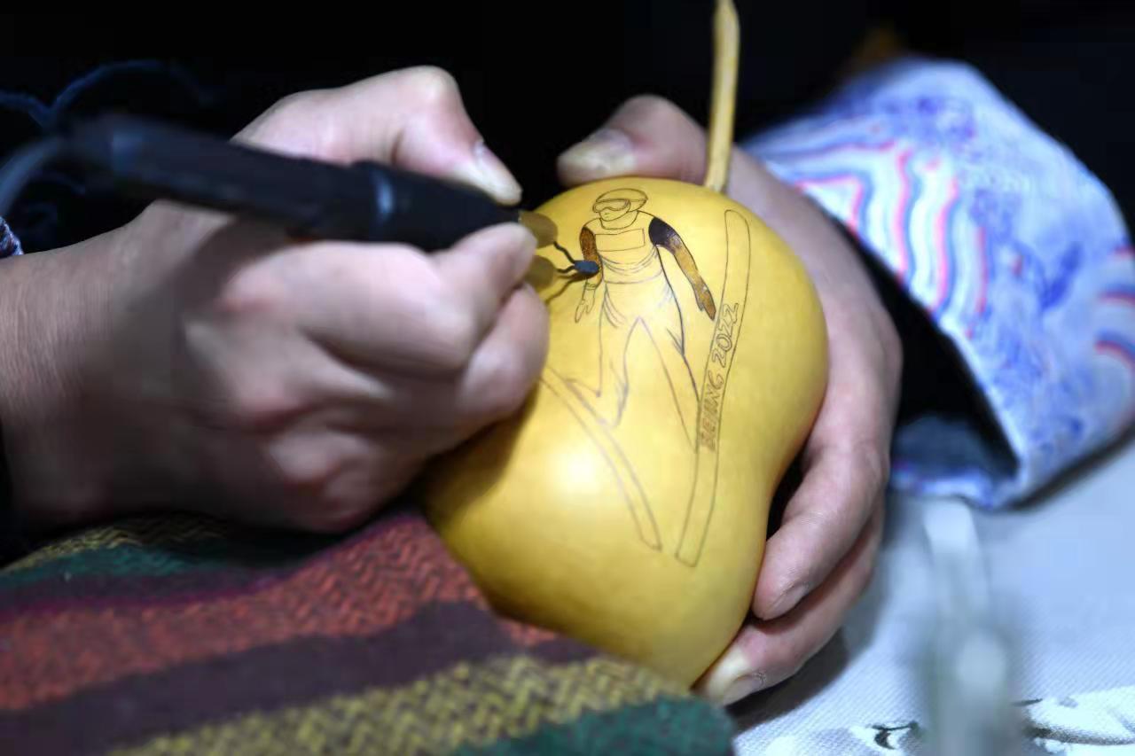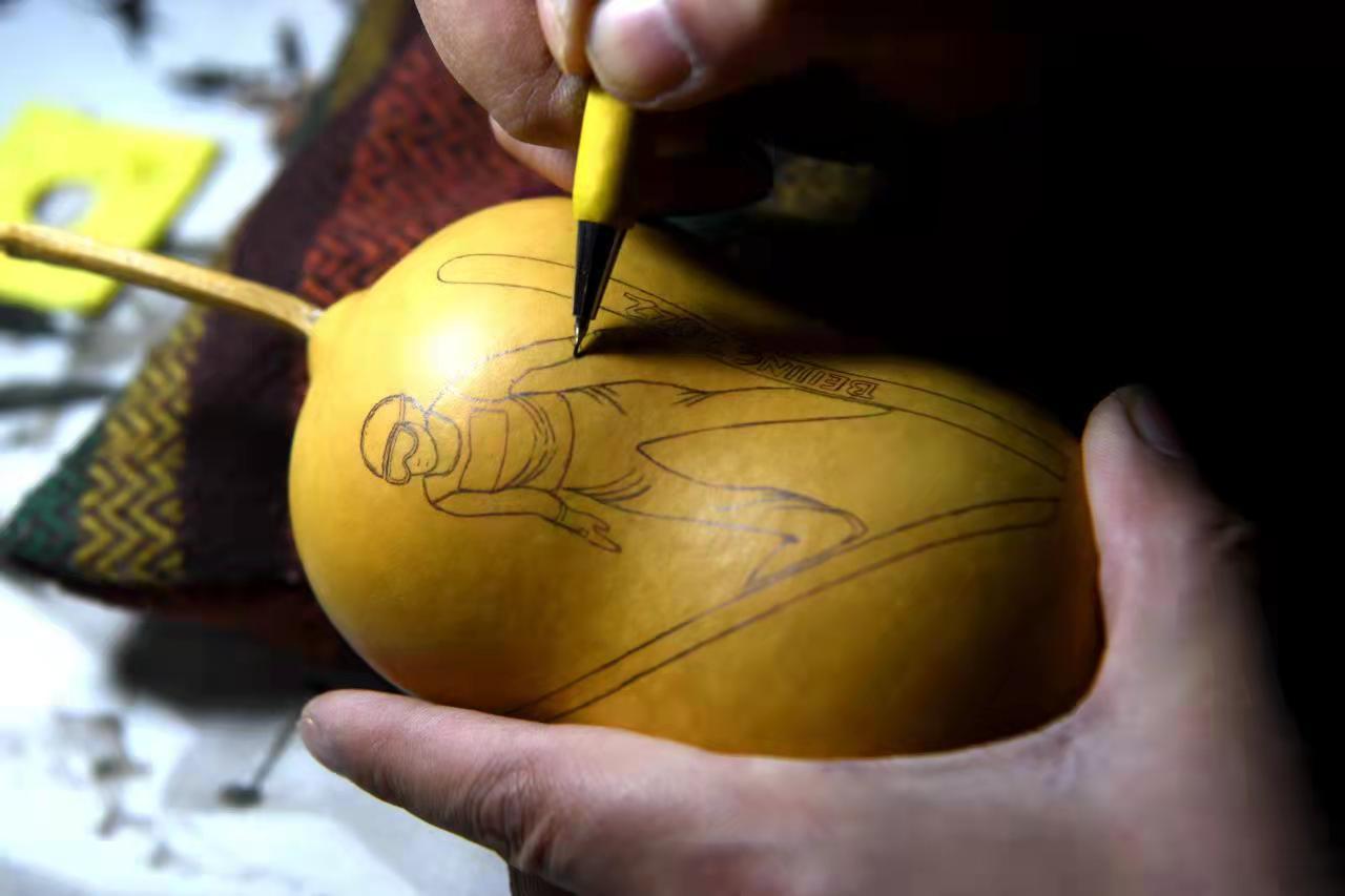 2月19日,衡水市饶阳县葫芦烙画艺人王凯正在创作以冬奥为主题的葫芦烙画作品。自北京冬奥会开幕以来,王凯将自己擅长的葫芦烙画与冬奥相结合,创作了系列主题作品。据介绍,葫芦烙画是一种传统工艺,通过烫、熨、刻等技巧在葫芦上作画,具有独特的艺术风格。