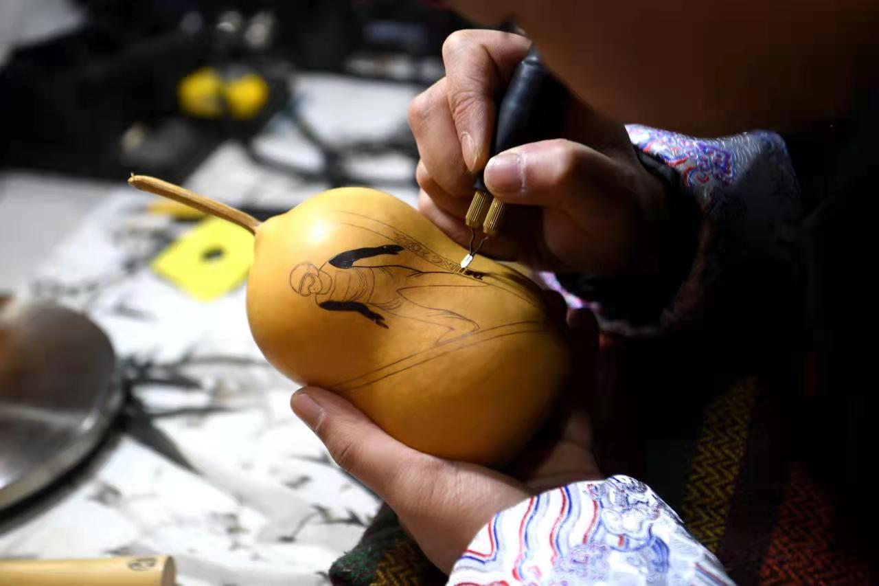 王凯在工作室进行葫芦烙画创作。崔佳栋 摄