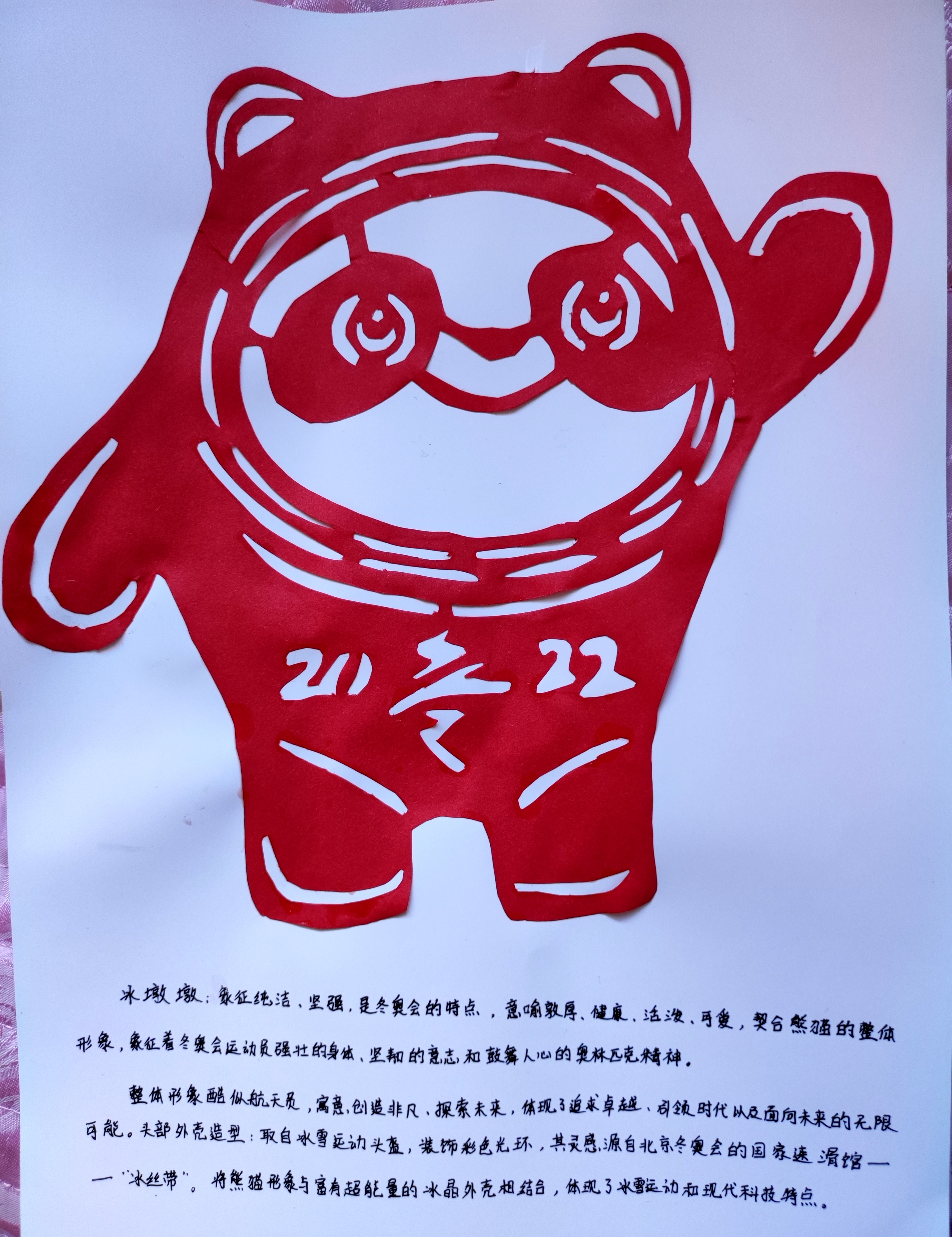 此外,有的孩子用手中的画笔画出了“冰墩墩”,还有的孩子通过剪纸剪出了“冰墩墩”……在孩子们的奇思妙想中,手工灯、蛋壳、面塑等各种各样创意的“冰墩墩”“雪容融”相继诞生。