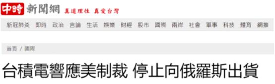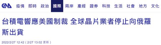 台湾“中央社”27日消息声称,俄罗斯“入侵”乌克兰,美国祭出制裁反制,包括台积电在内的全球电脑芯片业者已开始停止向俄罗斯出货。