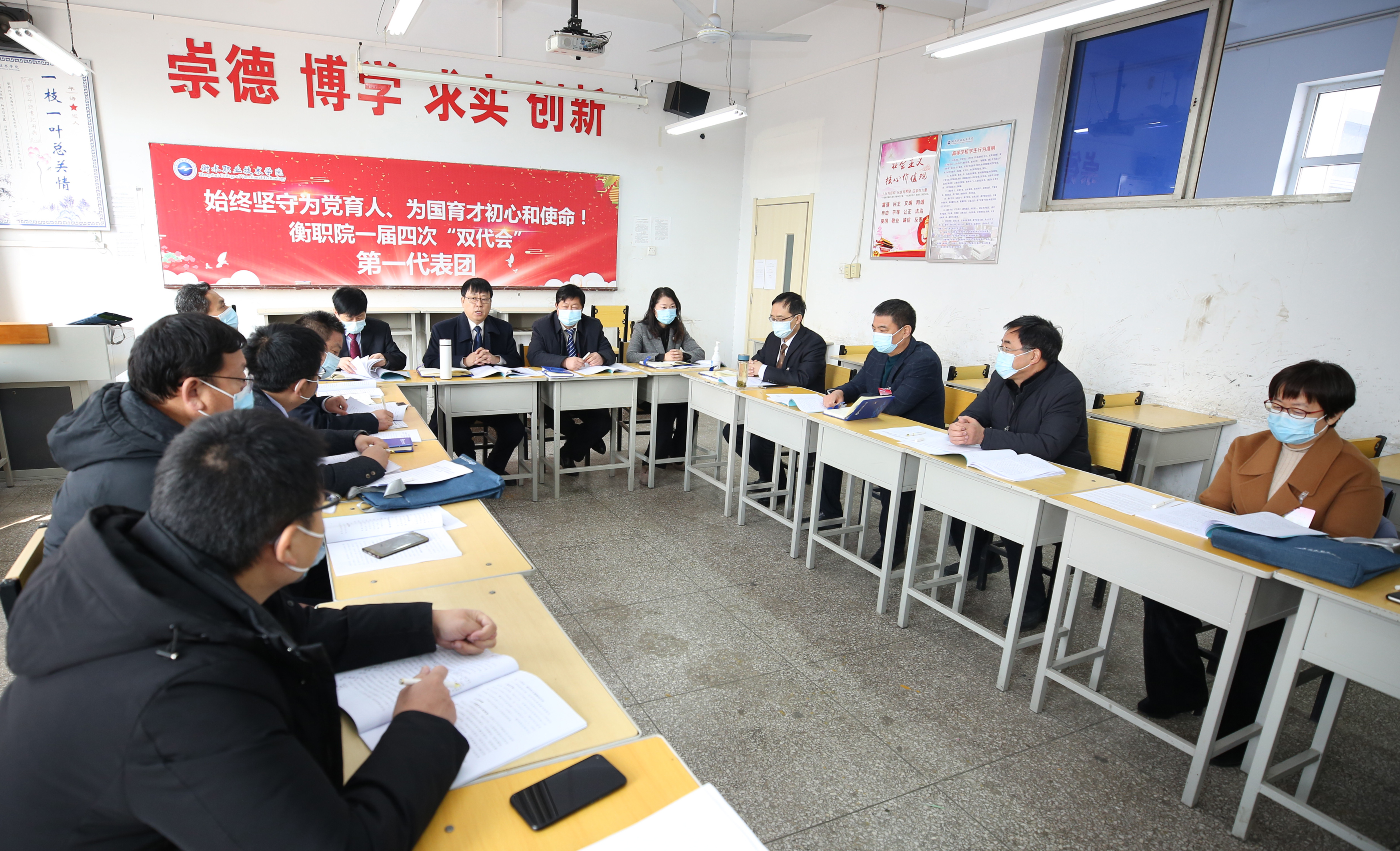 李增军作了《关于衡水职业技术学院“十四五”发展规划编制情况的说明》。《衡水职业技术学院“十四五”发展规划(草案)》(以下简称《规划》(草案))根据中央、省市有关文件精神,结合国家对高职教育的发展规划拟定起草,经过广泛调研、研究编制、征求意见、完善审定,数易其稿,最终形成五部分二十八节,共24000余字的《规划(草案)》。编写中遵循了坚持落实国家省市要求与学校实际相统一、坚持传承和创新相统一、坚持统筹兼顾与突出重点相统一、坚持民主与集中相统一的原则。《规划(草案)》总结了“十三五”期间的成绩,重点提出必须始终坚持把加强党的领导作为办学治校的根本保证,必须始终坚持把立德树人作为发展的根本任务,必须始终坚持把改革创新作为追赶超越的强进动力,必须始终坚持把产教融合作为职业教育改革的基本路径,必须始终坚持把高质量发展作为办学治校的主题主线,必须始终坚持把以师生为中心作为工作的根本目的。《规划(草案)》剖析了学校面临的机遇与挑战,从时代发展、职教要求、学校使命等方面,阐述了学校未来发展面临的机遇和挑战。《规划(草案)》提出未来发展指导思想和发展目标,指出要坚持改革创新,牢固树立“扬长补短”发展理念,大力实施“一体多翼”发展战略,稳步构建“一校两制”办学体制;坚持产教融合,积极推进“三个融合”办学实践;坚持质量立校,以诊断改进为动力,以内涵建设为重点,以内控体系为保障,以“提质培优”和“创新发展行动计划”为抓手,深入推进“二次创业”,全面提升办学水平,力争建成“省域高水平高职学校”。明晰了遵循坚持党建引领把方向、服务区域明定位、问题导向补短板、内涵发展提质量、改革创新求突破“五大原则”,顺利完成阶段性目标和建设“省域高水平高职学校”的总体目标。《规划(草案)》的核心部分对学校“十四五”期间的主要建设任务从坚持党建引领,筑牢学校高质量发展基石;加强思想政治工作,完善“大思政”育人格局;紧贴产业发展前沿,打造高水平专业群;聚焦立德树人根本任务,助力学生全面发展;深化产教融合、校企合作,提升协同育人水平;聚焦区域经济社会发展,提升社会服务水平;健全干部队伍建设机制,激发干部队伍活力;坚持内培外引,打造高水平教师队伍;坚持创新驱动发展,开拓创业就业工作新局面;加快校园信息化发展,建设数字化衡职;深化对外开放合作,提升国际化办学水平;优化内部治理结构,提升学校治理水平;加强校园文化建设,提升校园文化软实力;统筹发展和安全,加强平安校园建设;坚持以师生为中心,不断增进师生幸福感、获得感等15个方面进行阐释,明确了推动学校发展的重点任务和改革举措。《规划(草案)》还提出了为完成规划在组织、制度、资金、质量等方面的保障措施。