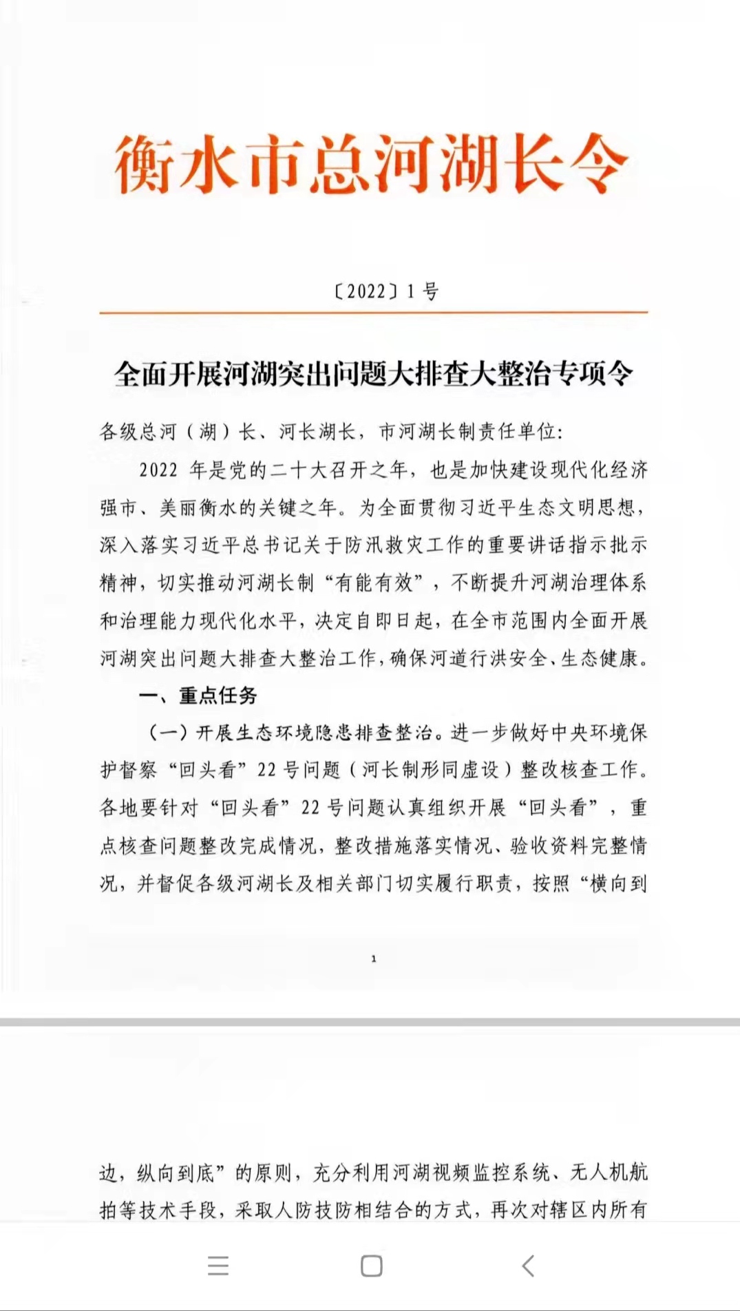 日前,我市发布2022年1号总河湖长令,要求在全市范围内全面开展河湖突出问题大排查大整治工作,确保河道行洪安全、生态健康。