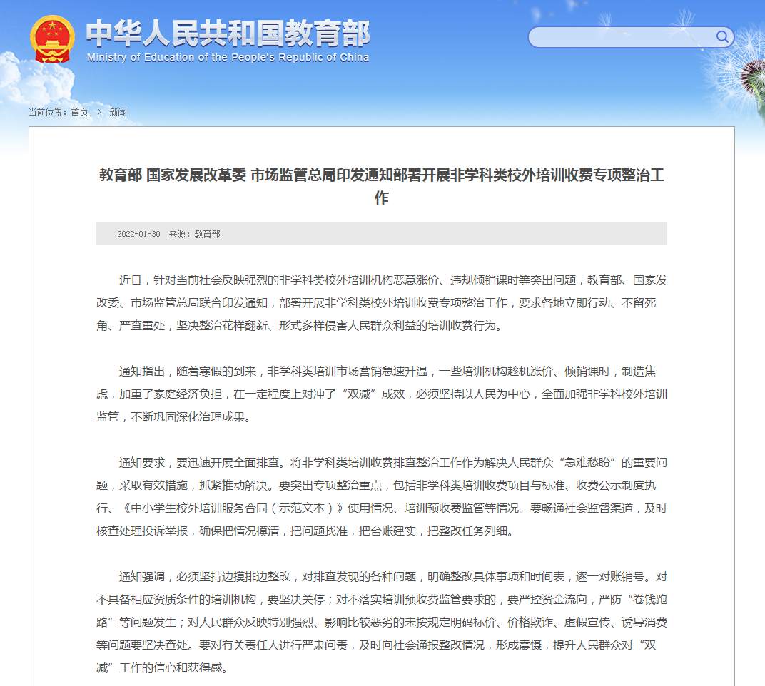 据教育部网站消息,为规范非学科类校外培训行为,有效防范培训质量不高、价格肆意上涨、存在安全隐患等问题,保护学生及家长合法权益,规范非学科类校外培训行业发展,教育部、国家发展改革委、市场监管总局发布关于规范非学科类校外培训的公告: