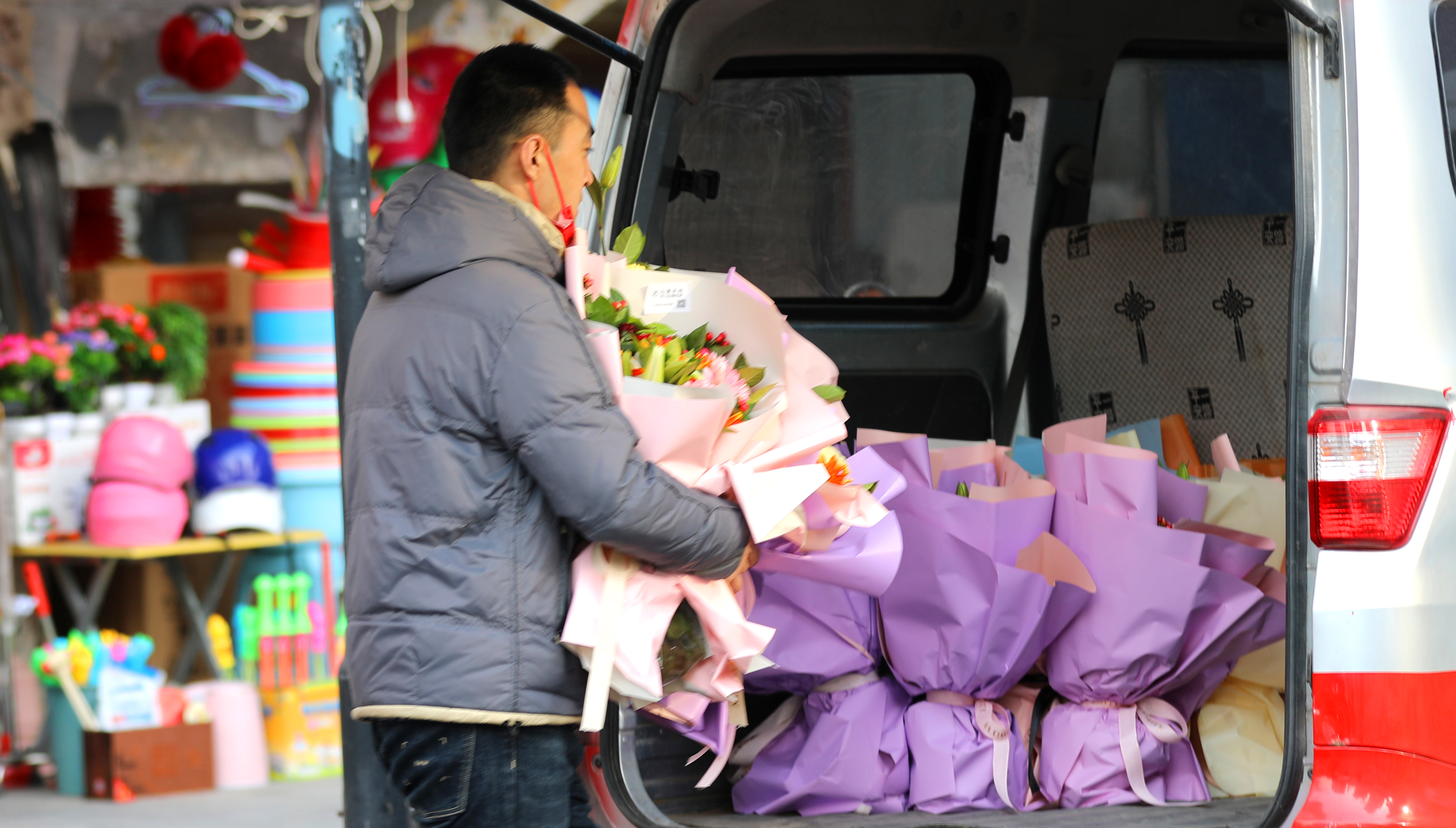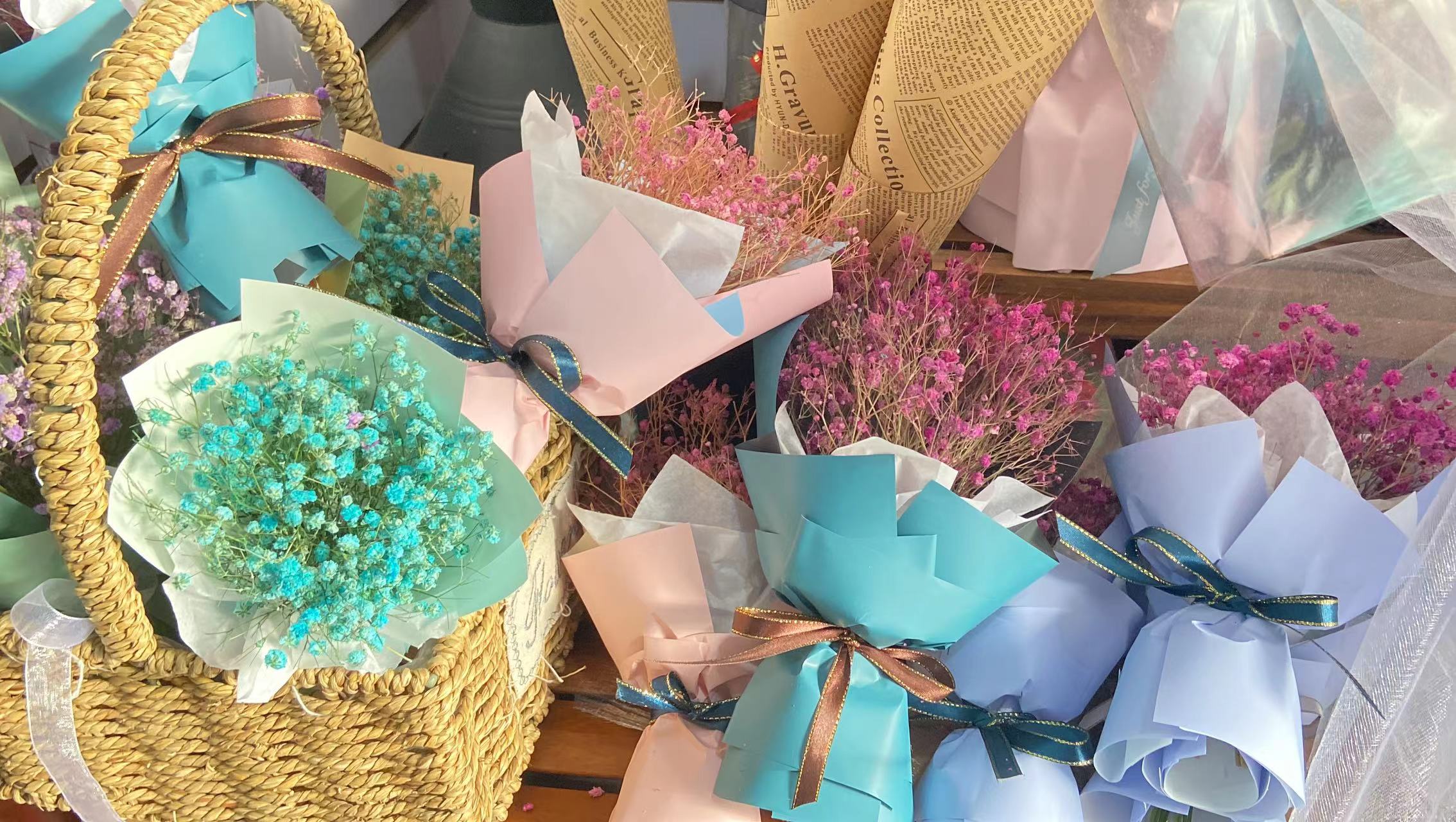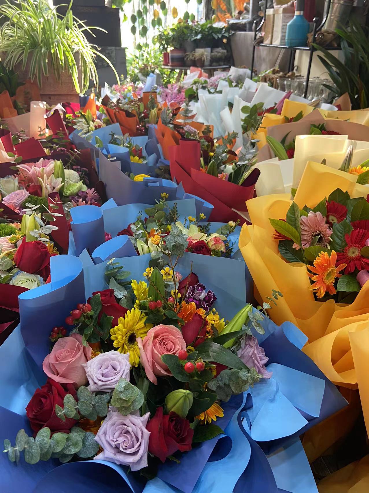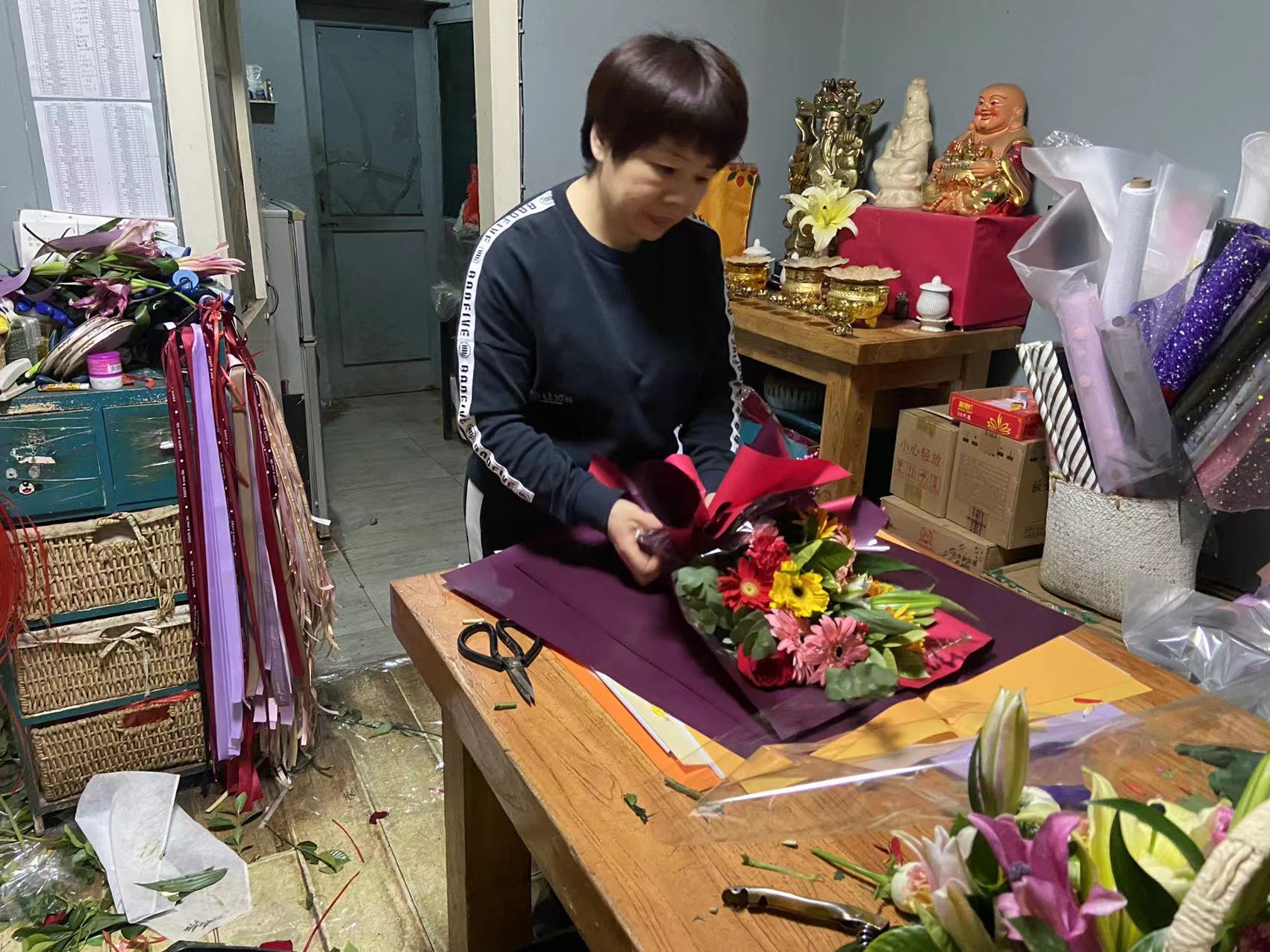 走进花店,满屋都是扎好的花束和摆满地的花材,康乃馨、玫瑰等热销鲜花被放在店门口的醒目位置,店内更是挤满选购鲜花的顾客及来取订单的快递员,店内的花艺师正忙着将搭配好的鲜花包扎成束。