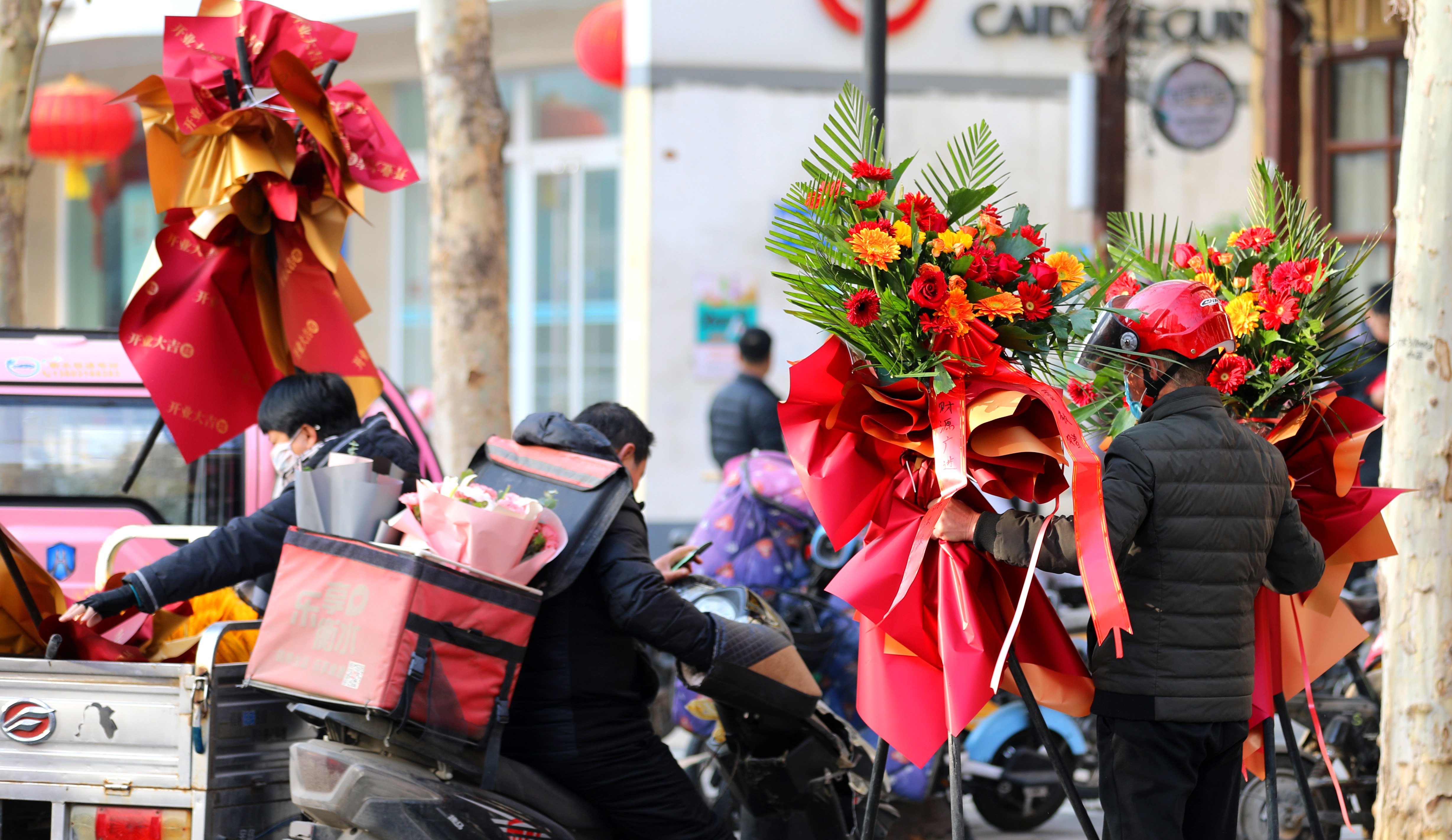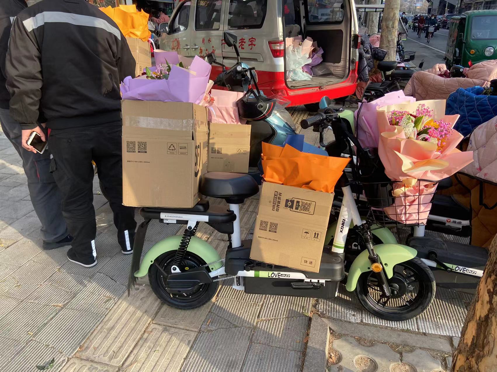 8日一大早,市区报社街几家花店门前,数名快递、跑腿小哥已等候多时,店内花束刚一扎好便赶紧忙着装车。一名顺丰同城快递员告诉记者,现在送的都是前一天预约的订单,几乎每名同城快递员都有上百束鲜花需要配送。为了在不破坏花束的基础上,一次能多送几束,他们在电动车的脚踏板和后座上放置了纸箱,加上车筐,一趟能送6束,大大节约了配送时间。