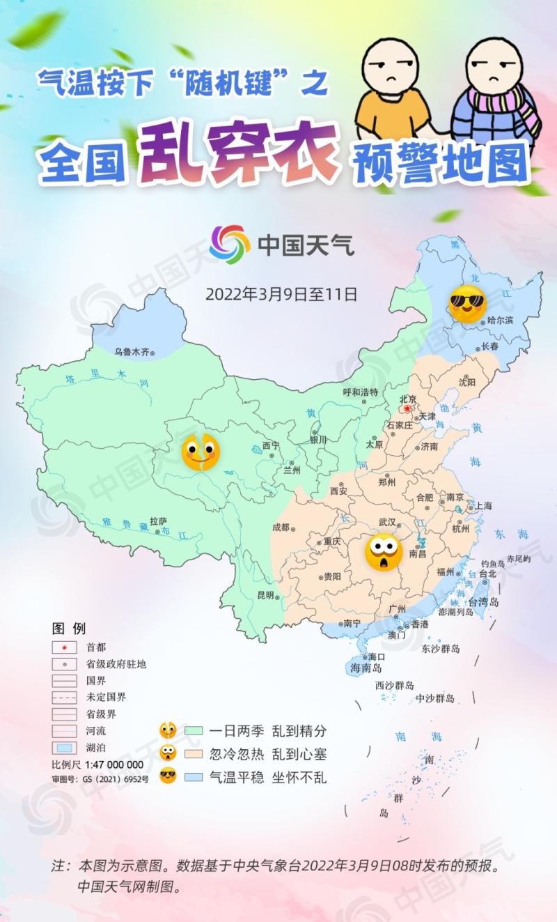 近日,全国大部气温开启“随机模式”,早上出门还是寒气袭人,中午就一派春意融融。每天醒来发愁的不是吃什么,而是出门穿什么。中国天气网贴心奉上全国乱穿衣预警地图,让你在任性的天气里穿衣不发愁。