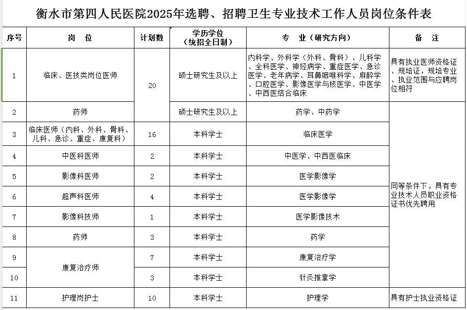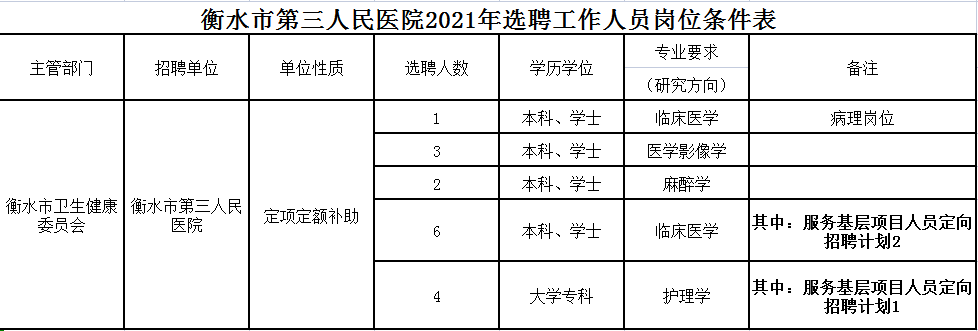 附:衡水市第三人民医院2021年选聘工作人员岗位条件表