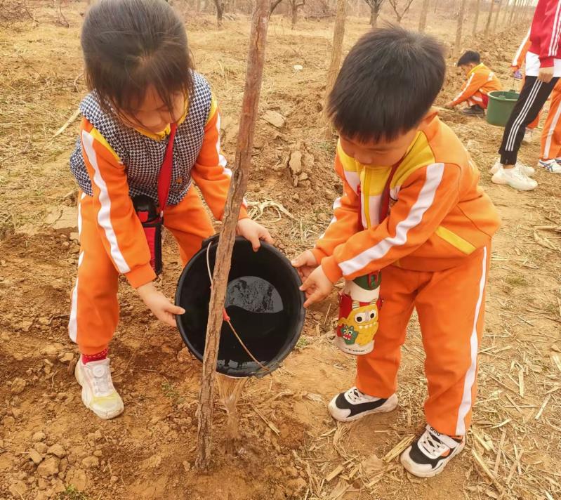 活动开始前,绮苑农庄的专业园林老师为大家普及了植树的相关知识。随后,大家纷纷拿起铁锹、铁铲等工具,把一株株树苗植入树坑,并细心地往坑内填土、培实,打水、提水、浇水,孩子们热情高涨,个个忙得不亦乐乎。最后,孩子们在老师的带领下,将写有“我与小树一起健康成长”和自己姓名的认养牌挂在自己种植的小树上,开心地与小树一起合影留念。6岁的刘紫硕看着自己新栽的小树迎风挺立,高兴地说:“这是今天我和同学一起种下的小树,希望它快快长大。”