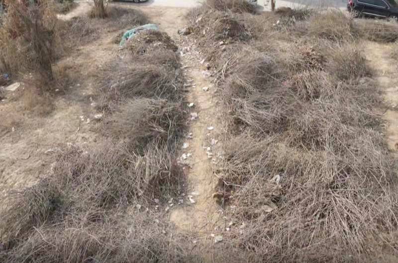 当日15时许,记者来到该交叉口,只见西北角分别有一个街边公园和一座公共卫生间。在公共卫生间北侧的空地上,堆积着不少枯草藤蔓,中间有条一米多宽的小路。顺着小路向东走去,两侧堆积着许多从树木上修剪下来的枯枝,形成长约十余米的枯枝带,其内夹杂着塑料袋等垃圾,杂乱不堪。