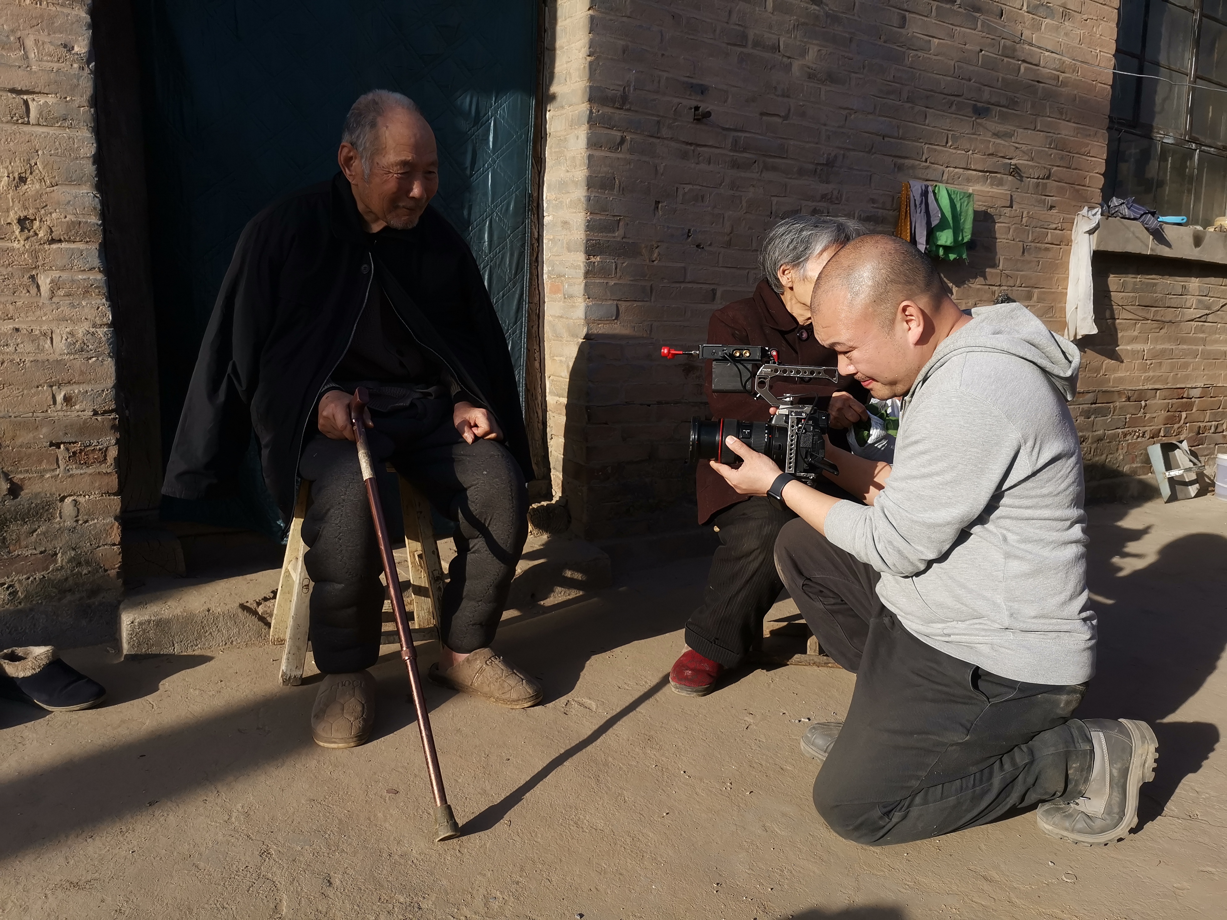 摄制组在安平县大同新村(原槐林庄)采访冀中骑兵团三打槐林庄的亲历者岳彦卿、知情人王万增。
