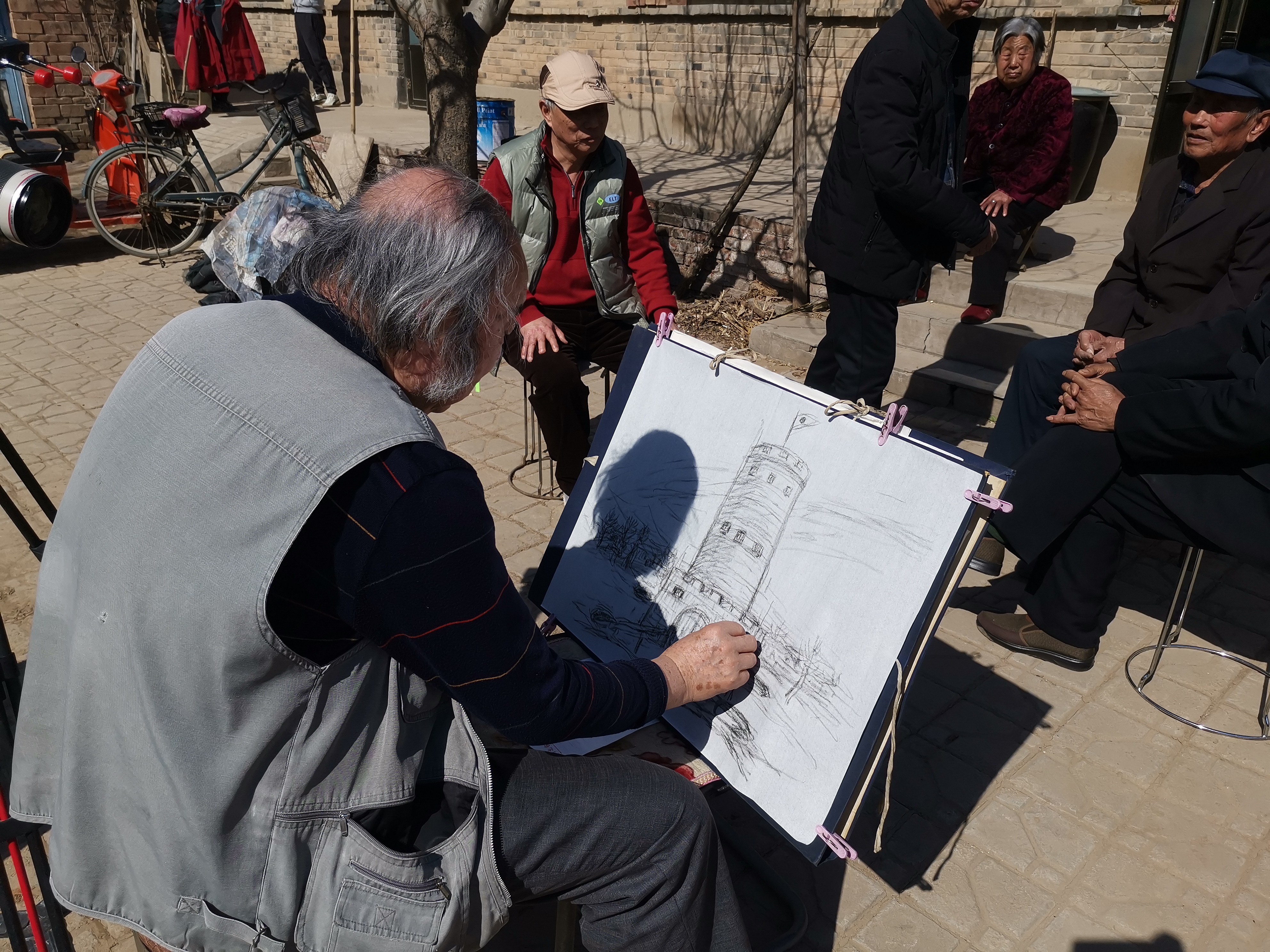 原北京出版社美术编辑宋光森先生根据村民描述,现场作画还原冀中骑兵团三打槐林庄战斗场景。