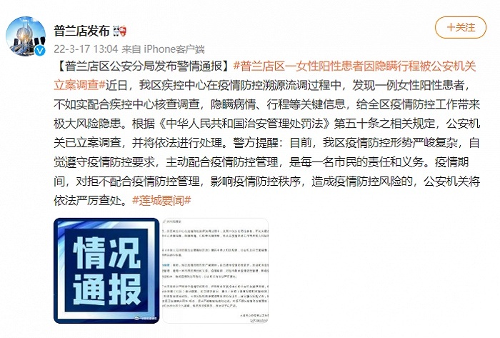 @普兰店发布 消息,近日,大连普兰店区疾控中心在疫情防控溯源流调过程中,发现一例女性阳性患者,不如实配合疾控中心核查调查,隐瞒病情、行程等关键信息,给全区疫情防控工作带来极大风险隐患。根据《中华人民共和国治安管理处罚法》第五十条之相关规定,公安机关已立案调查,并将依法进行处理。