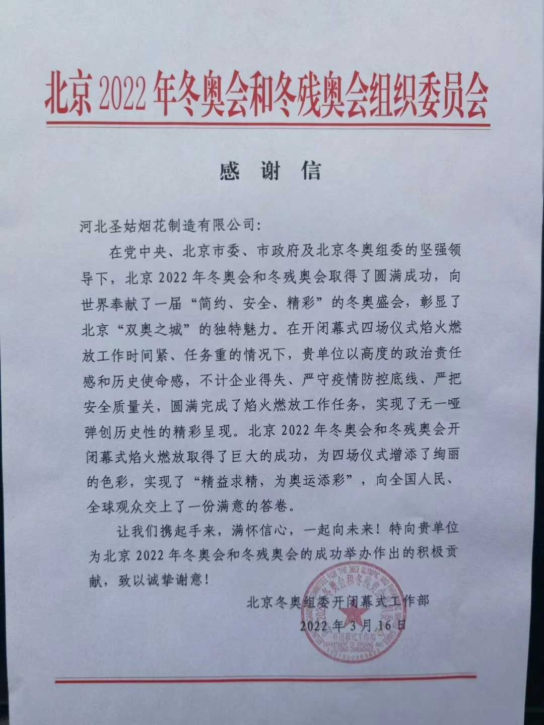 如今,圣姑烟花在北京冬奥会、北京冬残奥会上的成功燃放,又为圣姑烟花添上了浓墨重彩的一笔。而且,圣姑烟花还得到了北京2022年冬奥会和冬残奥会组委会的认可,感谢信中说:“在开闭幕式四场仪式焰火燃放工作时间紧、任务重的情况下,贵单位以高度的政治责任感和历史使命感,不计企业得失、严守疫情防控底线、严把安全质量关、圆满完成了焰火燃放工作任务,实现了无一哑弹创历史性的精彩呈现。北京2022年冬奥会和冬残奥会开闭幕式焰火燃放取得了巨大的成功,为四场仪式增添了绚丽的色彩,实现了‘精益求精,为奥运添彩’,向全国人民、全球观众交上了一份满意的答卷。”