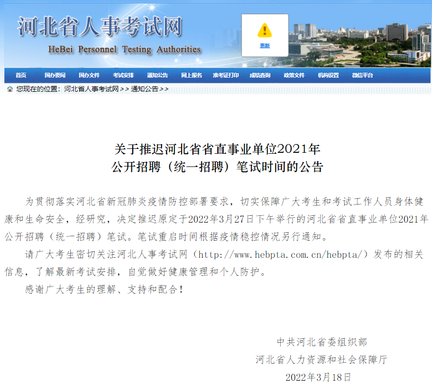 为贯彻落实河北省新冠肺炎疫情防控部署要求,切实保障广大考生和考试工作人员身体健康和生命安全,经研究,决定推迟原定于2022年3月27日下午举行的河北省省直事业单位2021年公开招聘(统一招聘)笔试。笔试重启时间根据疫情稳控情况另行通知。