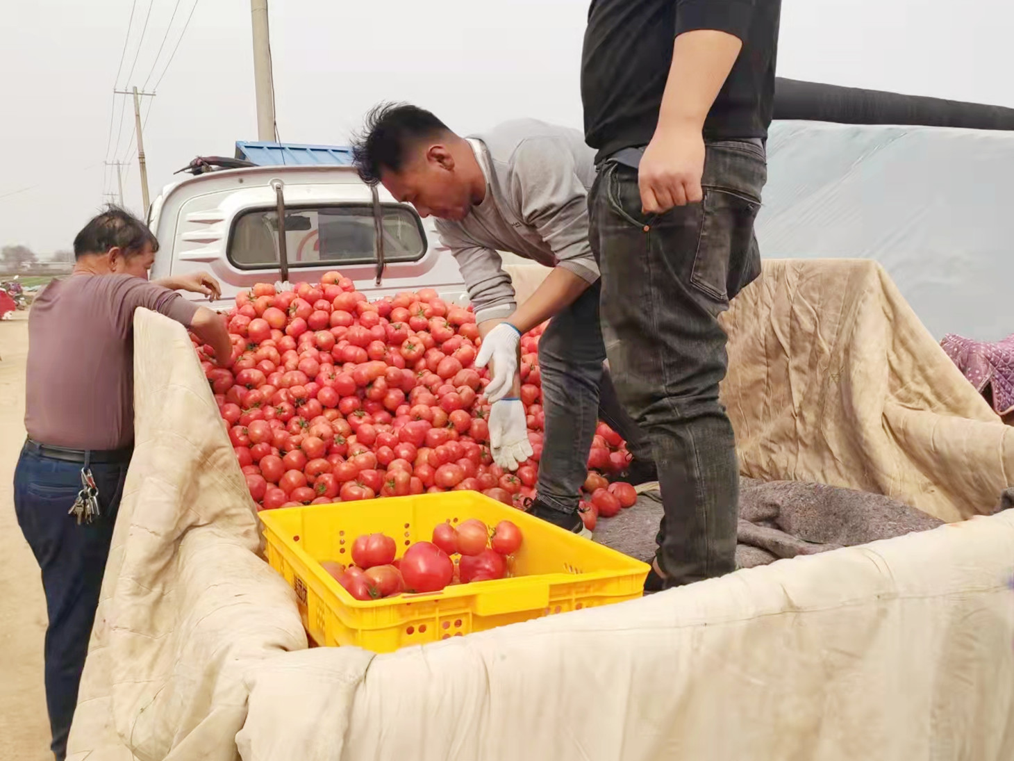 村民正在将西红柿装车运输。高松超 摄