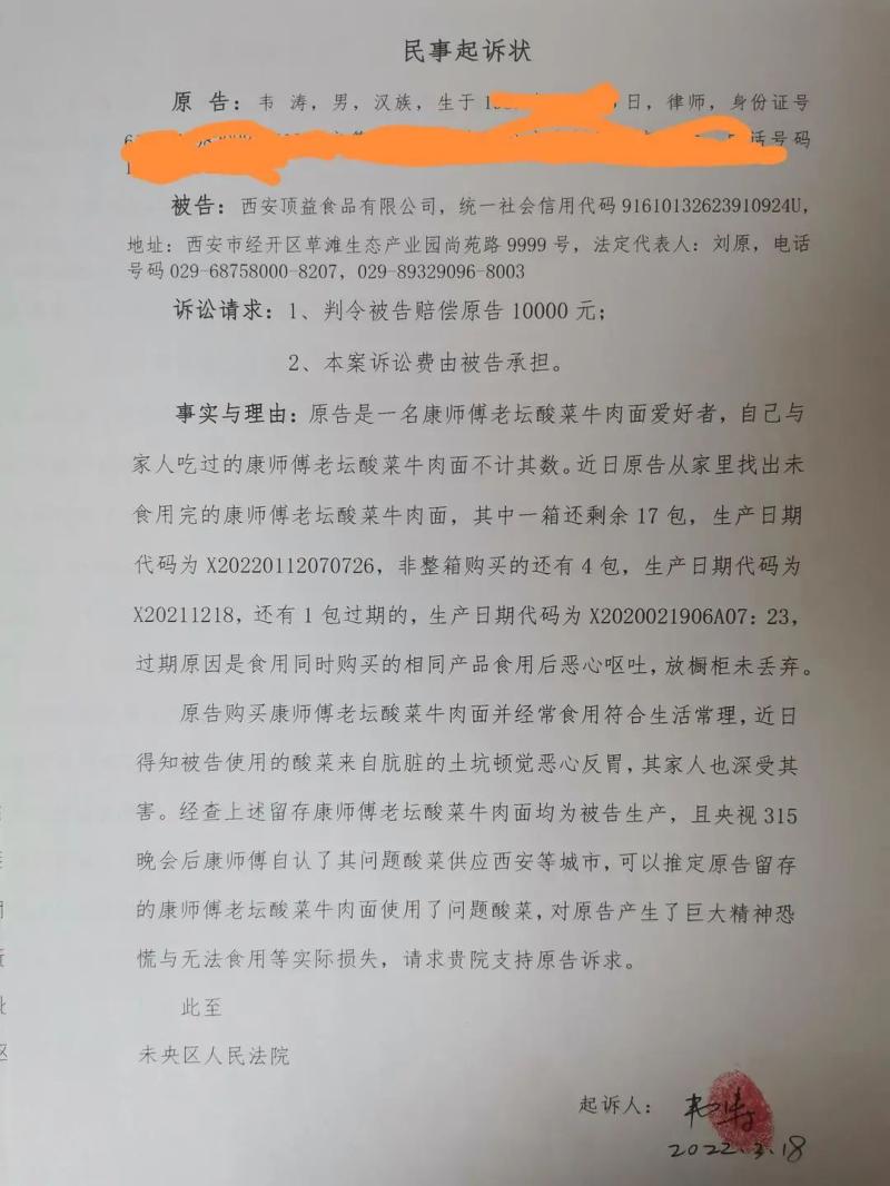 韦涛对西安顶益食品有限公司的民事起诉状 韦涛供图