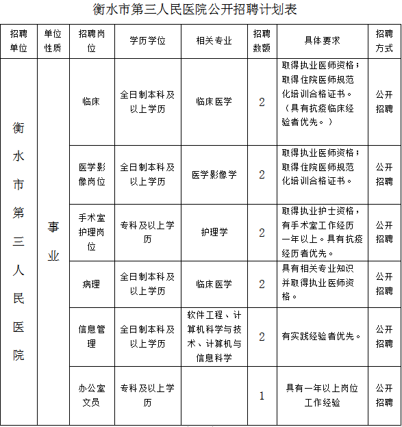 详见附件《衡水市第三人民医院公开招聘计划表》。