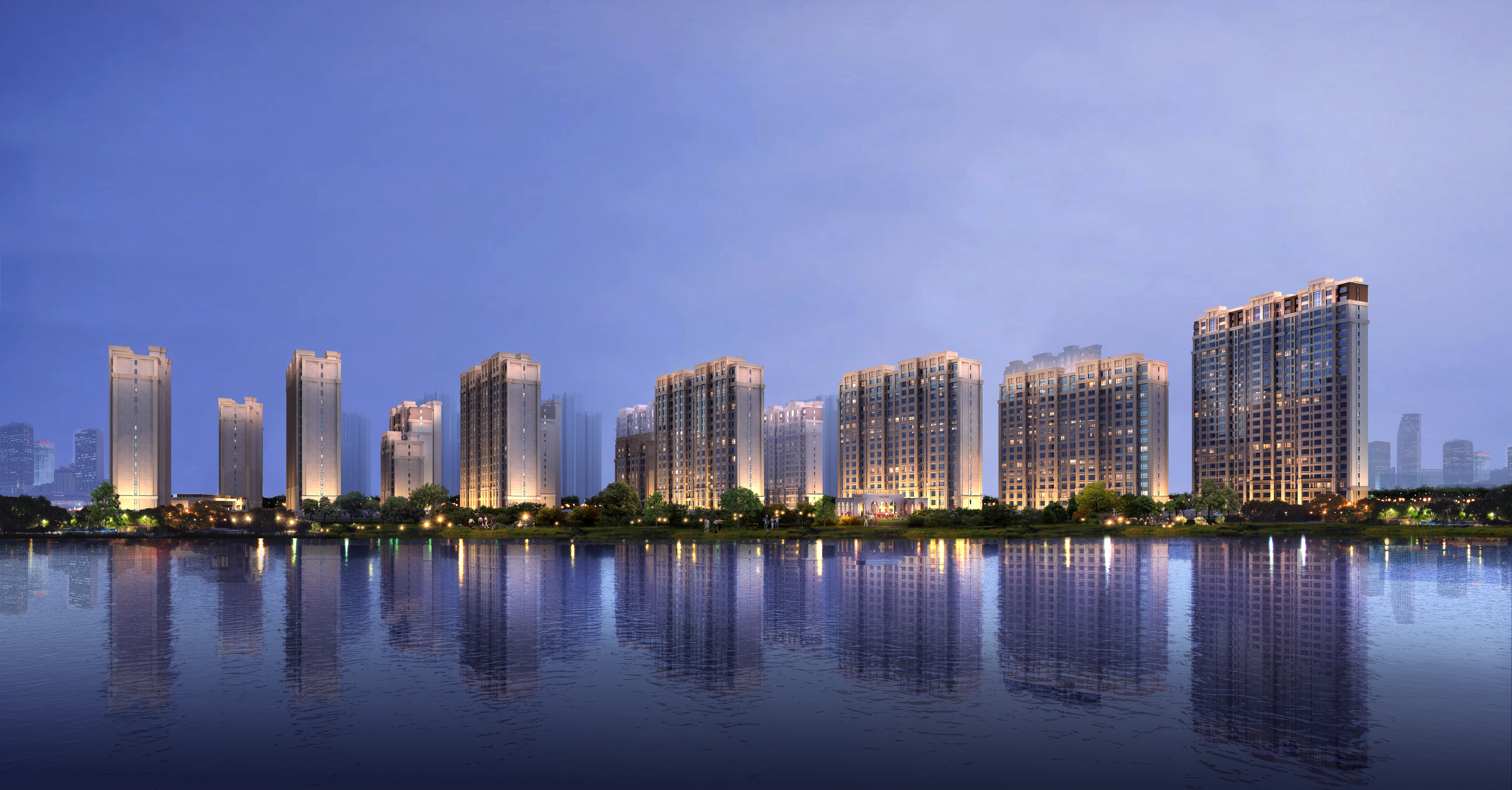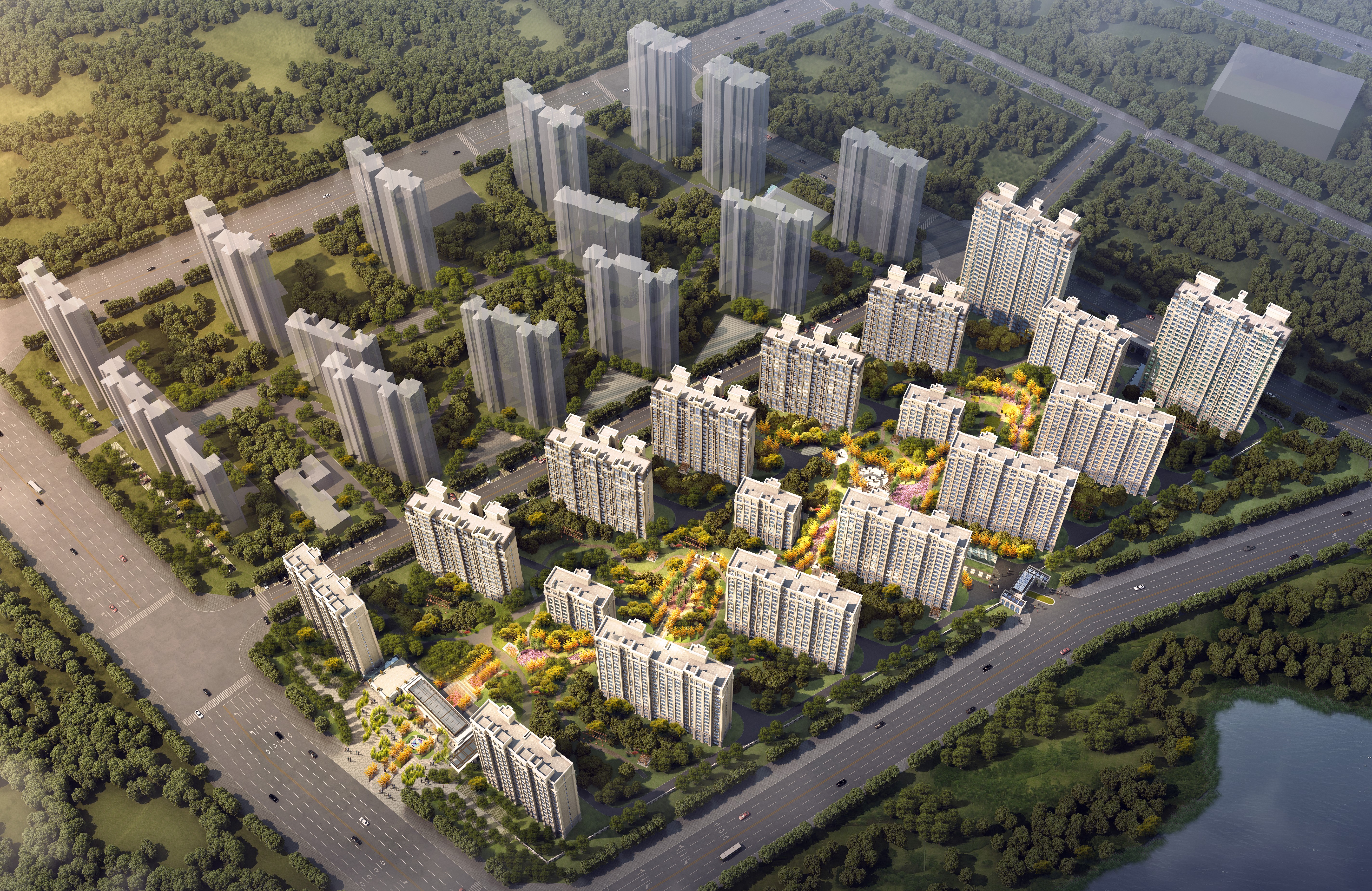 项目东地块占地约8.9万㎡,容积率2.09,总建筑面积约24.5万平米,绿化率35%,目前在建的是项目一期,建筑面积在120-210㎡之间。东地块以“法式轻奢”为定位方向,依据东侧巨吴渠绿带景观需求,规划建筑排布,使整体呈现北高南低,沿街退进的趋势,楼栋间形成东西向瞰河观景视觉通廊,为城市贡献更加优美的天际线形态。