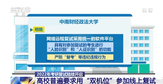 中南财经政法大学明确网络远程复试采用统一的软件平台,具有对参加复试的考生进行“人脸识别”和“人证识别”的功能,严防“替考”等违纪违规行为。