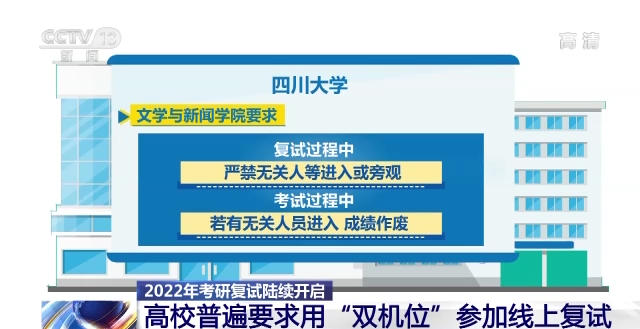 四川大学2022年硕士研究生复试通知由各院、系、所单独发布。文学与新闻学院要求,考生本人应保持发型整洁,素颜、露耳且不可佩戴首饰,严禁设置录音录像设备,复试过程中严禁无关人等进入或旁观,考试过程中若有无关人员进入,成绩作废。