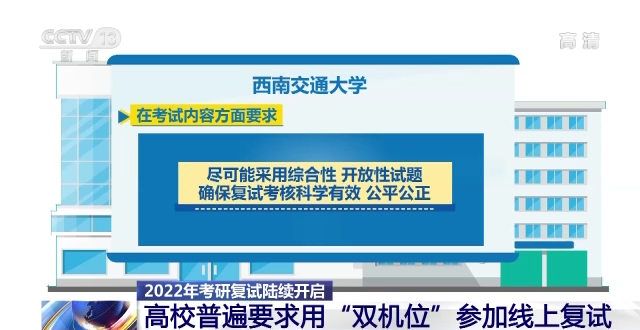 在考试内容方面,西南交通大学要求,网络远程视频复试考核包括但不限于考生自述、抽题作答、专家提问等部分,尽可能采用综合性、开放性试题,确保复试考核科学有效、公平公正。