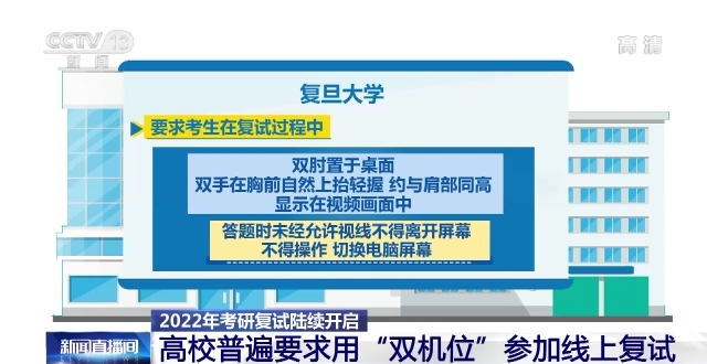 复旦大学要求考生在复试过程中应双肘置于桌面,双手在胸前自然上抬轻握、约与肩部同高,显示在视频画面中,答题时未经允许,视线不得离开屏幕,不得操作、切换电脑屏幕。