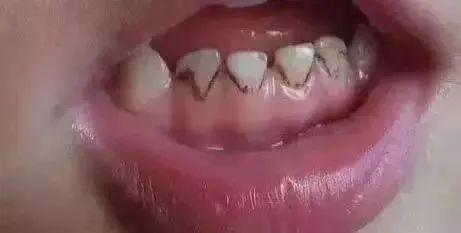 黑色素如下图,摸起来牙齿表面光滑,黑黑的,用手指抠或者刷牙的时候能弄掉一点点,但是始终无法完全清除,这就是黑色素。