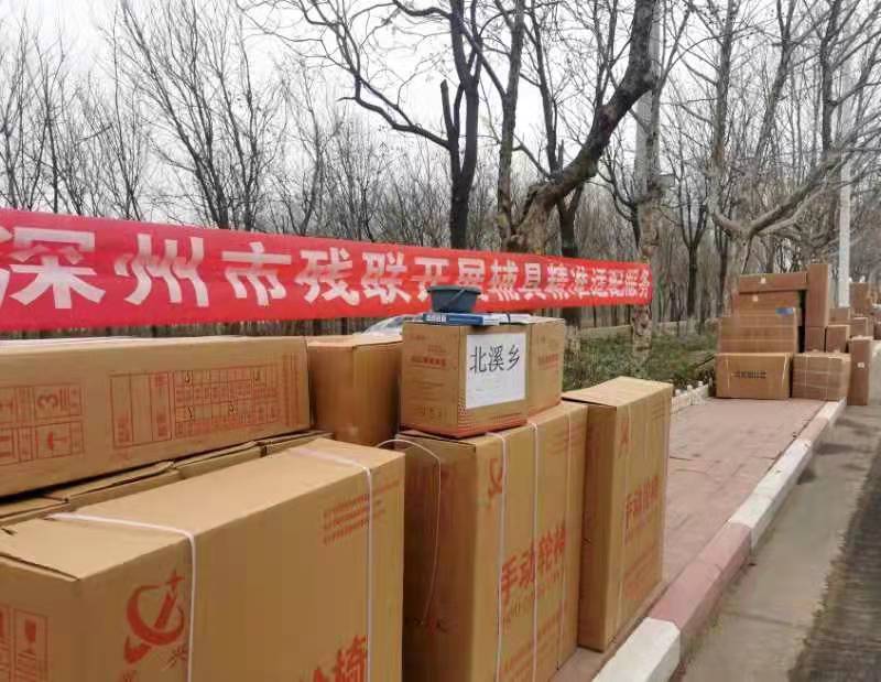 当天,轮椅、助行器、助听器……一箱箱崭新的残疾人辅助器具,整齐地摆放在深州市泰山东路街边,各乡镇残联工作人员正忙着帮残疾人代领。