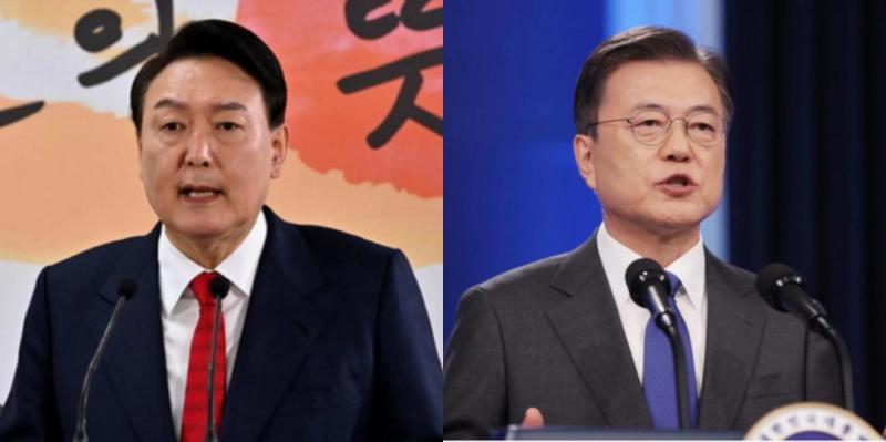 总统文在寅(右)和当选总统尹锡(左)悦将于28日下午6时在青瓦台正式会面并共进晚餐。