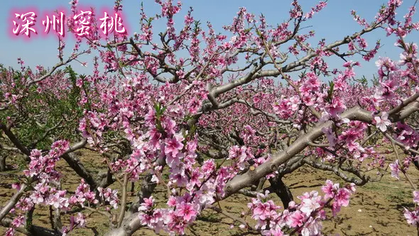 深州蜜桃驰名中外,有2000多年的栽培历史。蜜桃花朵大,花瓣肥厚,舒展,红粉中有嫩叶的点缀,高雅素丽,雍容淡雅。一年一度的深州桃花观赏时节又将来临,深州以盛产蜜桃而扬名,到处都是桃园。深州穆村乡西马庄的蜜桃观光园是有名的观花地,上万亩桃花竞相绽放,如虹似霞,成方连片,美不胜收。