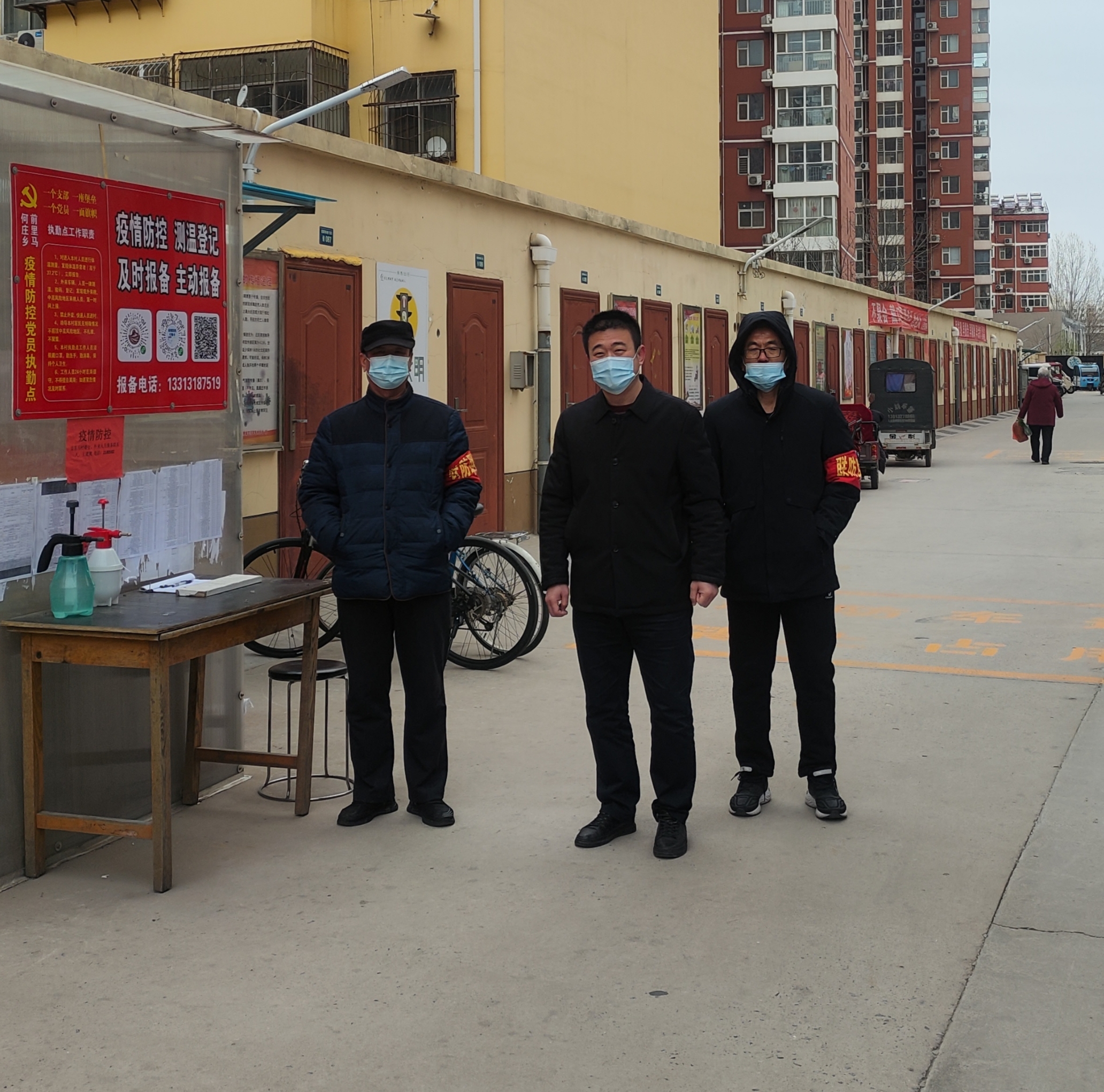 陈磊(中)组织党员代表义务值守,做好疫情防控工作。