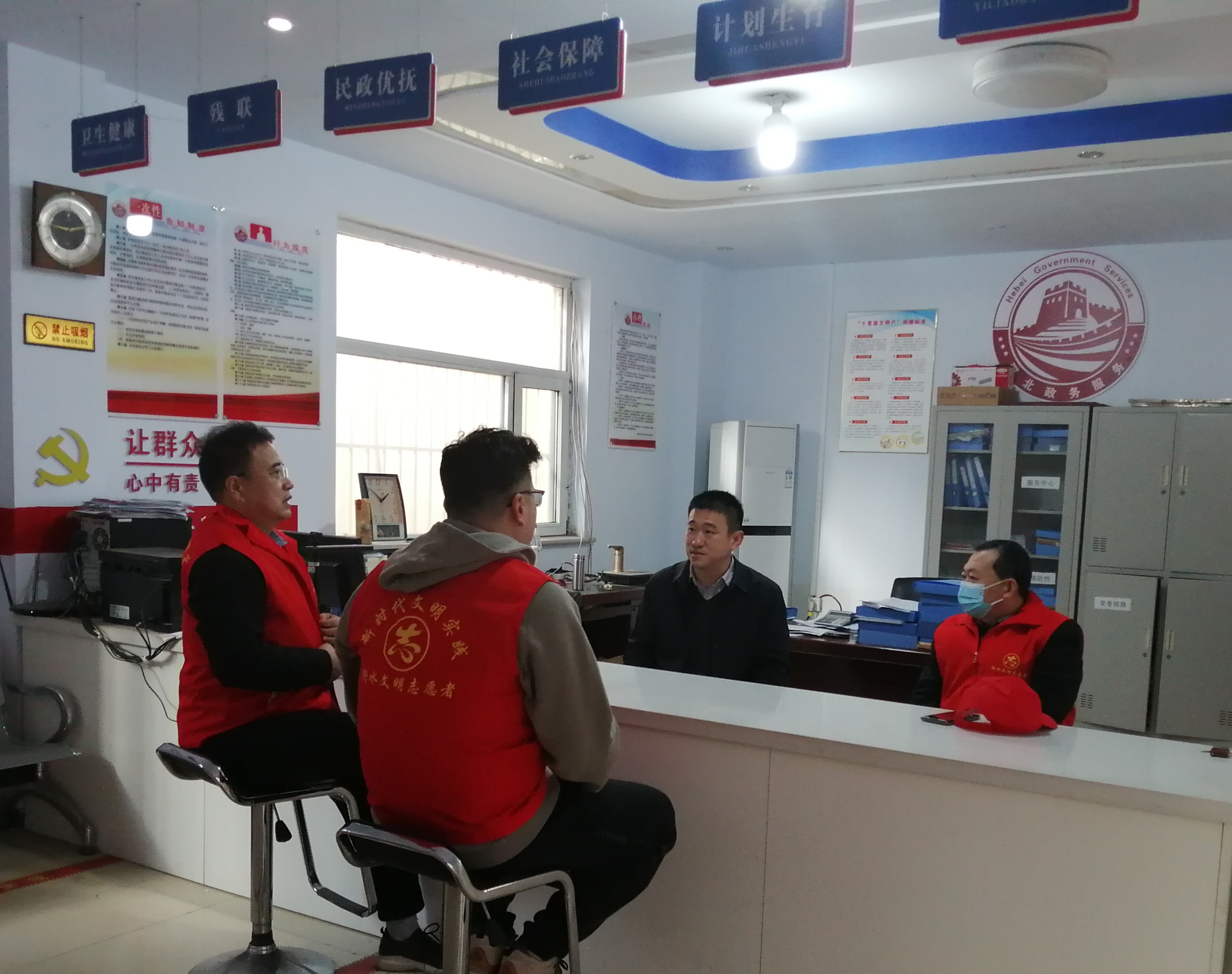 陈磊(右二)与志愿者探讨开展学雷锋志愿者服务工作。