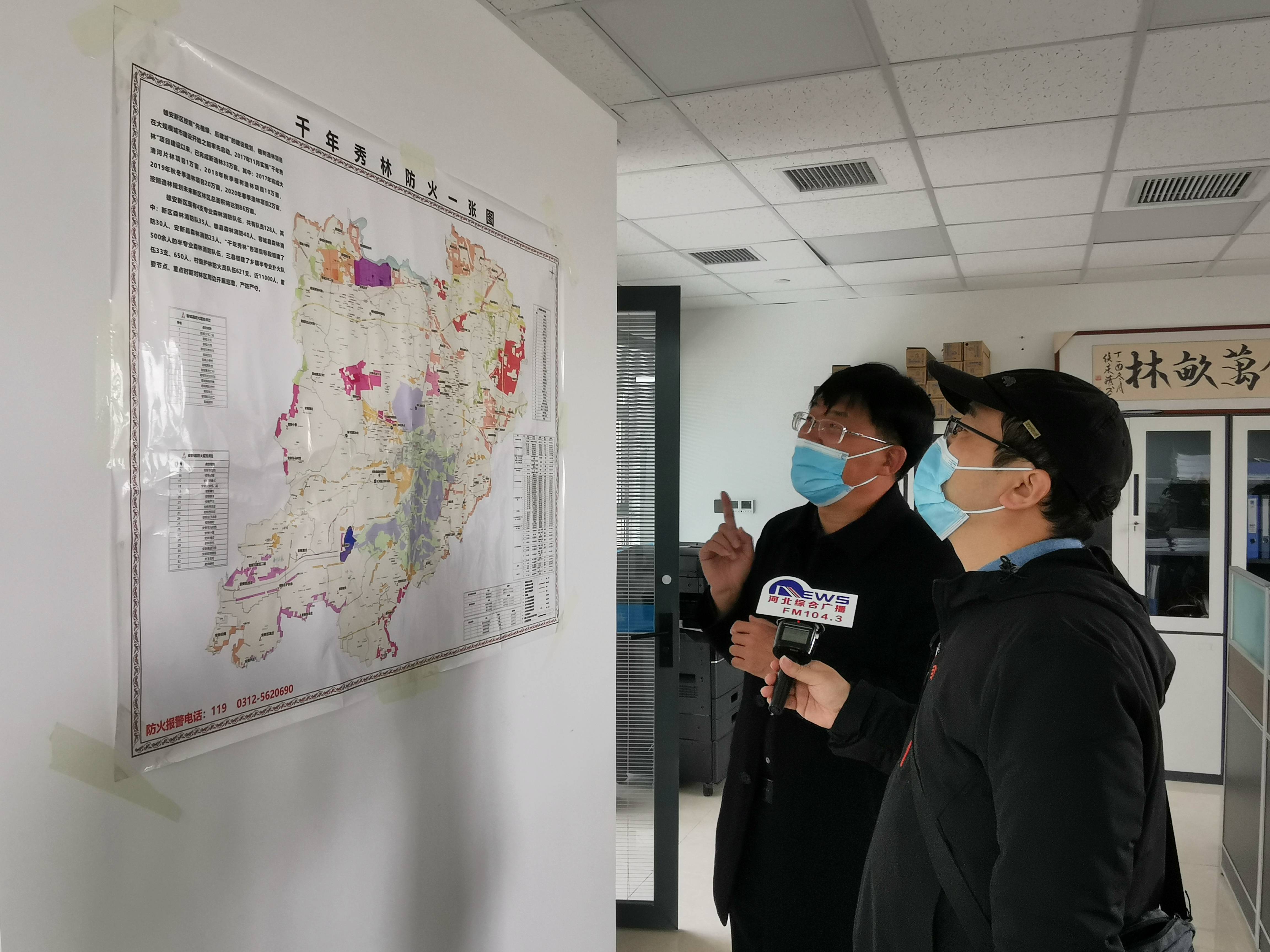 徐成立(左)给记者王谦介绍雄安新区的植树理念