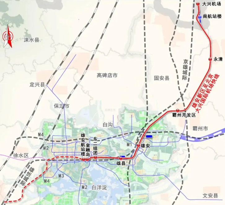 正在建设中的雄安新区至北京大兴国际机场快线(R1线),全长86.2公里,设站8座,设计速度200公里/小时,被称作新区与北京的市域轨道交通。