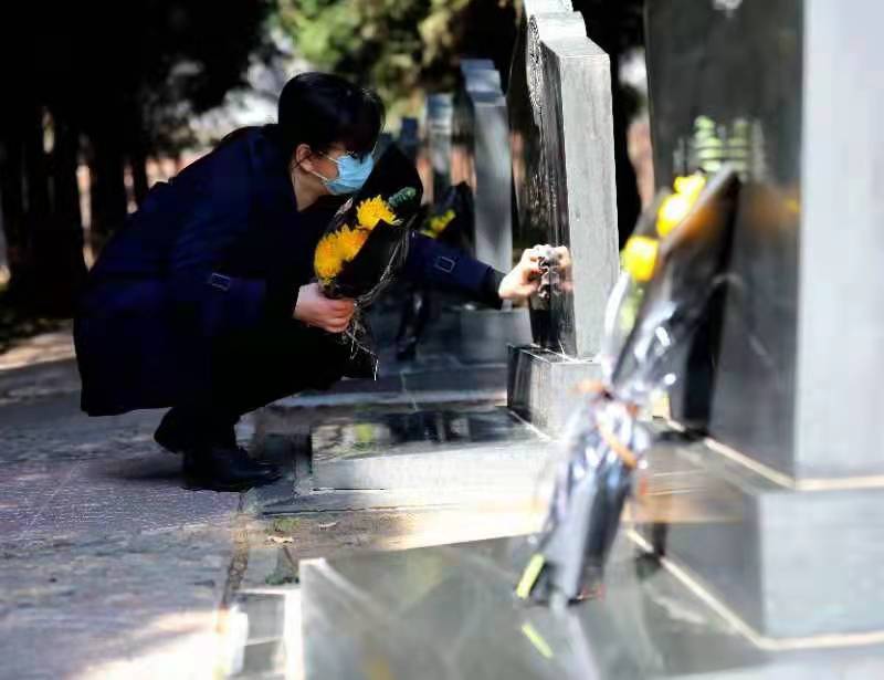 沿着笔直的小路,穿过成荫的树林,映入眼帘的是庄严肃穆的烈士墓区,每一个被擦得铮亮的墓碑前都放着一束黄菊。长眠于此的57名烈士,有38位有名烈士,19位无名烈士。彭辉告诉记者,近几年受疫情影响,陵园先后闭园、限流、不接待团体祭扫,一些外地的烈士亲属无法到陵园祭奠亲人。为此,陵园主动联系每一位烈士亲属,为无法到陵园祭扫的烈士亲属提供以擦拭一遍墓碑、敬献一束鲜花、打一个慰问电话为内容的代祭扫服务,在大力弘扬英烈精神的同时为烈士亲属带去温馨和慰藉。