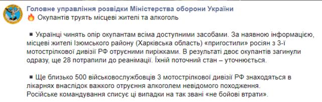 根据乌克兰情报局发布在脸书上的一篇帖子,这些士兵来自俄罗斯第三机动步枪师。该帖子称,有2名俄军士兵在伊久姆被给予有毒蛋糕后死亡,有28人在重症监护室接受治疗,另有500名俄罗斯士兵因严重酒精中毒被送往医院。