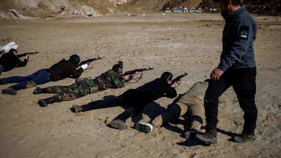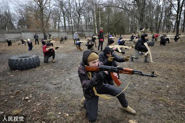 当地时间2022年2月19日,乌克兰首都基辅,当地平民参加军事训练学习使用枪支