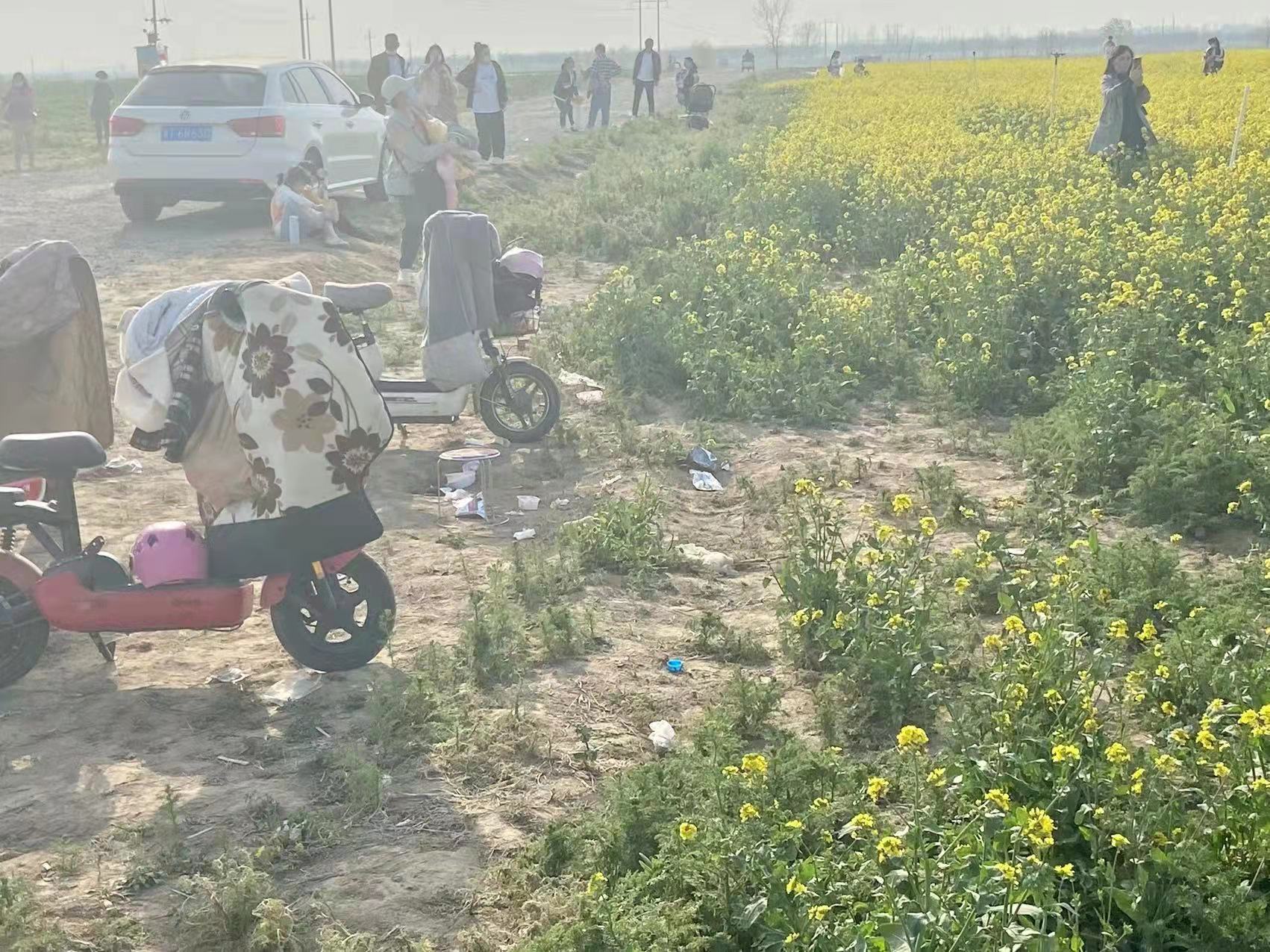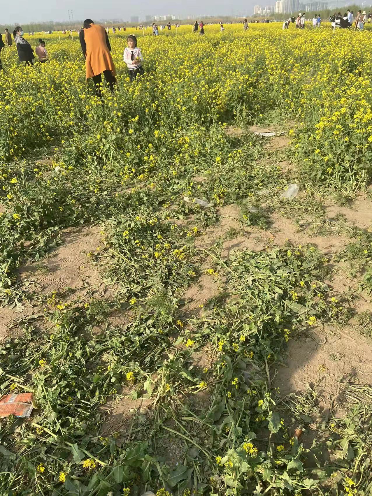 在大地花海的油菜花田,虽然景点为方便大家赏花预留了空地,但仍有人肆意跑到花田里,有人直接坐在花田里拍起合影,为了画面好看,抓起一把花朵当作道具扔向天空;有的人带着孩子一起随意采摘,为的是让自己享受着亲子游的趣味;还有人在花田里放起了风筝,跑动中,不知道多少花苗被踩踏折断;还有人将在附件买的美食带到花中食用,产生了垃圾随意丢弃……大家似乎忘了,观赏油菜花更要学会顾惜田间油菜花,这也是文明出游最该具备的素养。